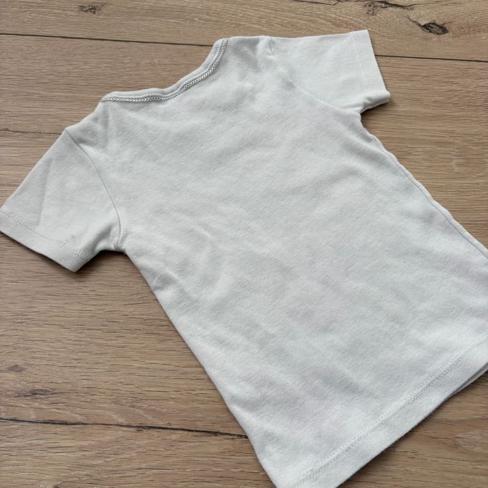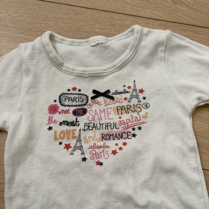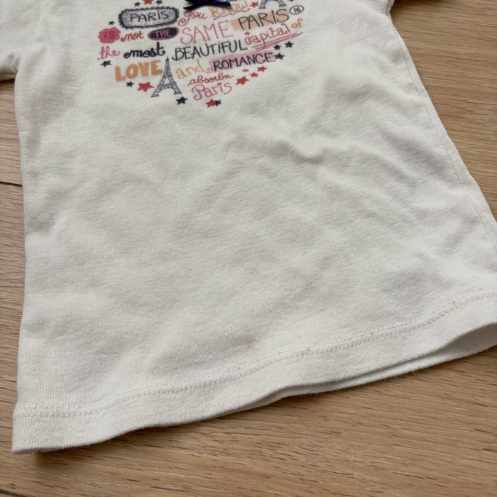Joli sous-pull manches courtes, coloris blanc, avec imprimé Paris / Tour Eiffel et petits détails graphiques. Idéal en sous-pull ou porté seul à la mi-saison. Taille : 24 mois – 86 cm (pas d’étiquette, estimation) État : très bon état, présence d’une petite tache discrète (voir photo), n’altère pas l’usage Matière douce et confortable Envoi rapide et soigné Maison non-fumeur