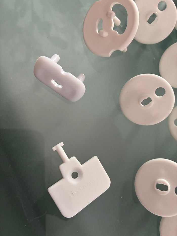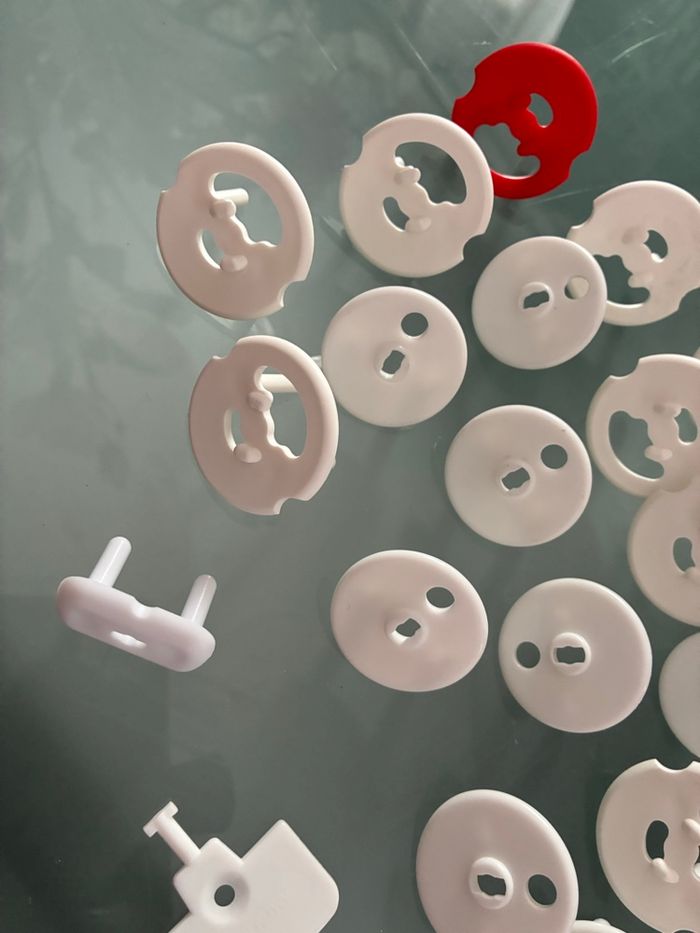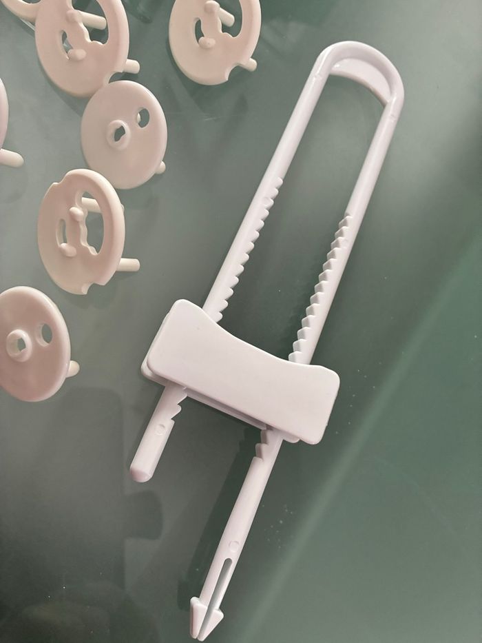 Lot comprenant 19 sécurités de prise électrique avec la clé + 1 bloc poignée de porte de placard Très bon état Marque : ampafrance pour les caches prises