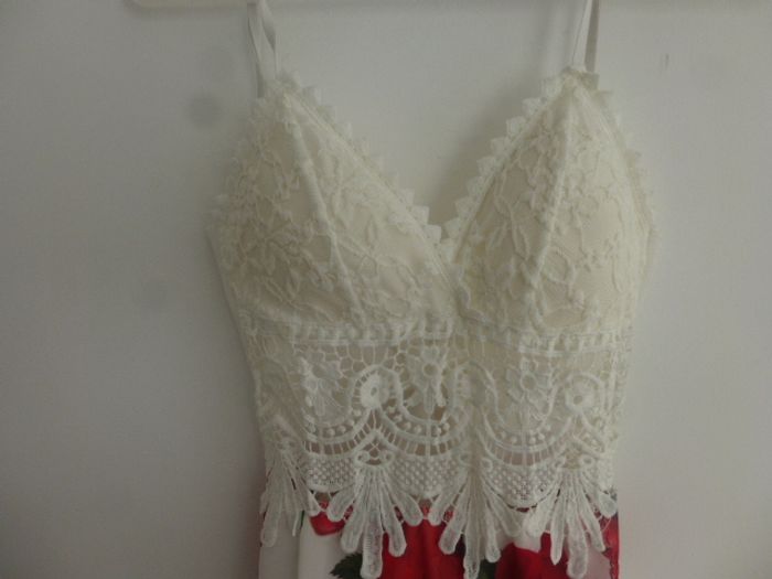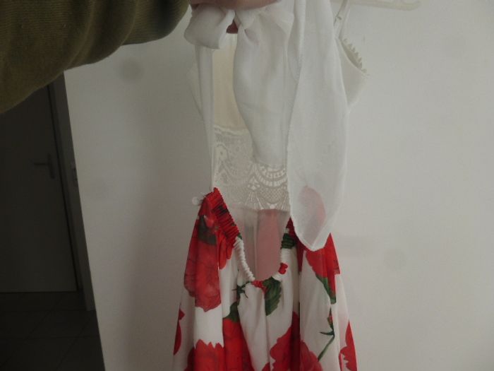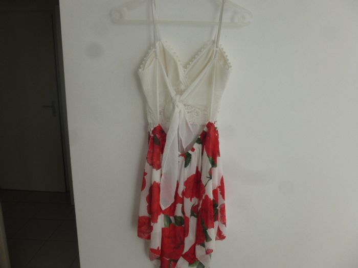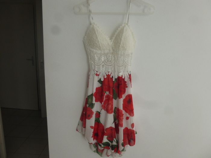 Robe d'été dos semi nu, décolleté en crochet blanc thème coquelicots
