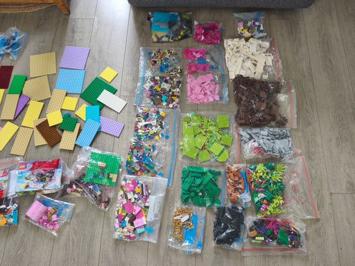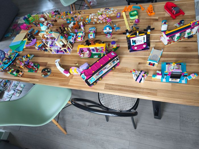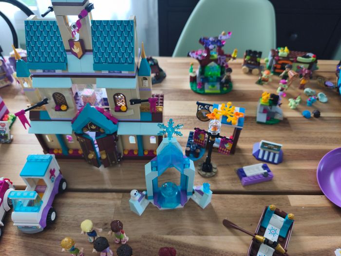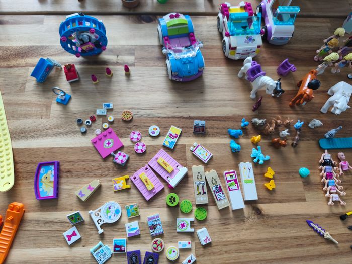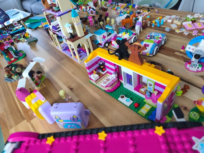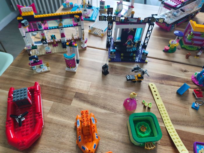 Gros lot de Lego Lego Friends Lego Elves Lego Disney Princesse Quelques notices. Certains sont complets ou quasi complet ( bateau elves, arbres elves, vétérinaires, roue hamster, bus , petit lego reine des neiges) Il reste beaucoup de pièces dans les sachets.