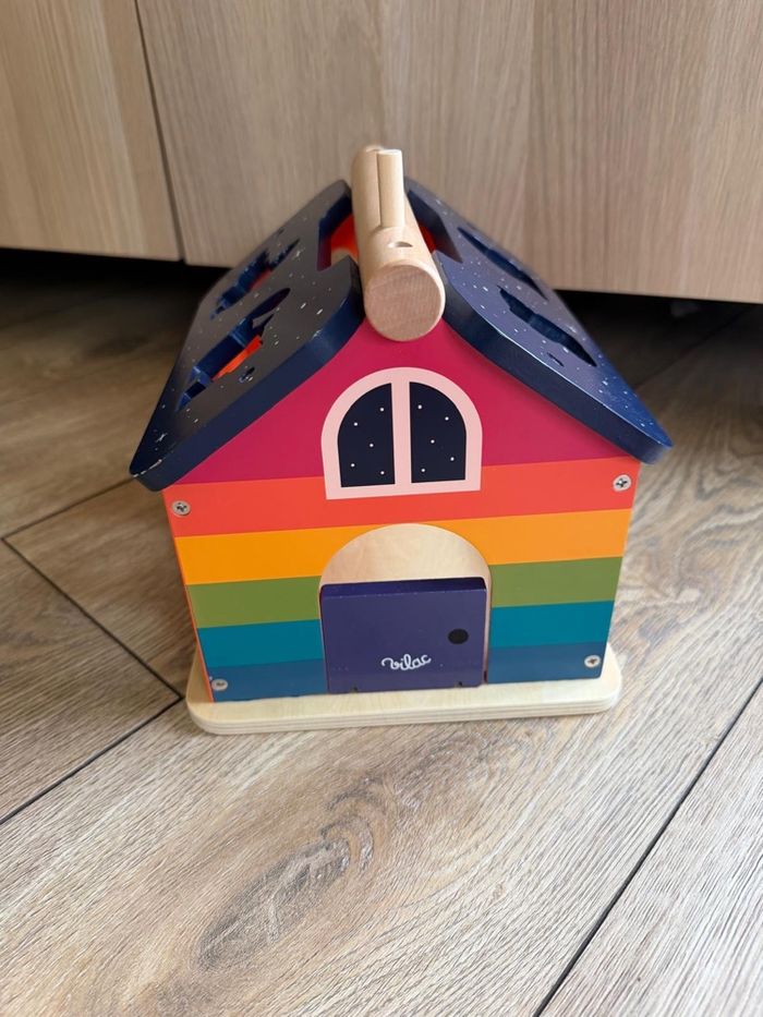 Maison des Formes de la marque Vilac, en bois, illustrée par Andy Westface.