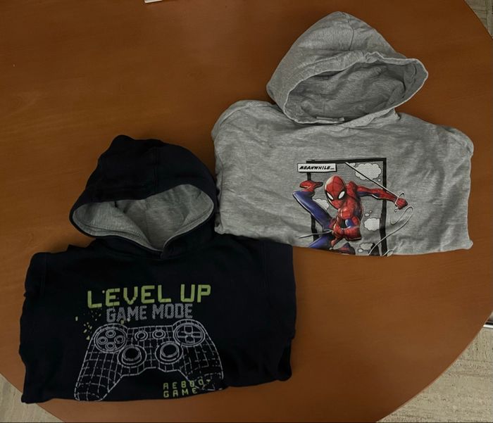 Bonjour, A vendre lot de 2 sweats 5€ le 2 Le Spiderman taille 11 ans. Le bleue taille 10 ans à des bouloches voir les photos au niveau du dessin Ils ont été portés Mis sur d’autres groupes de vente Regardez dans mon dressing j’ai des vêtements garçon du 3 mois à 10 ans Et des vêtements fille de la naissance à 4 ans