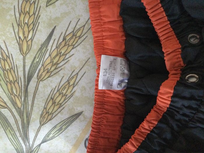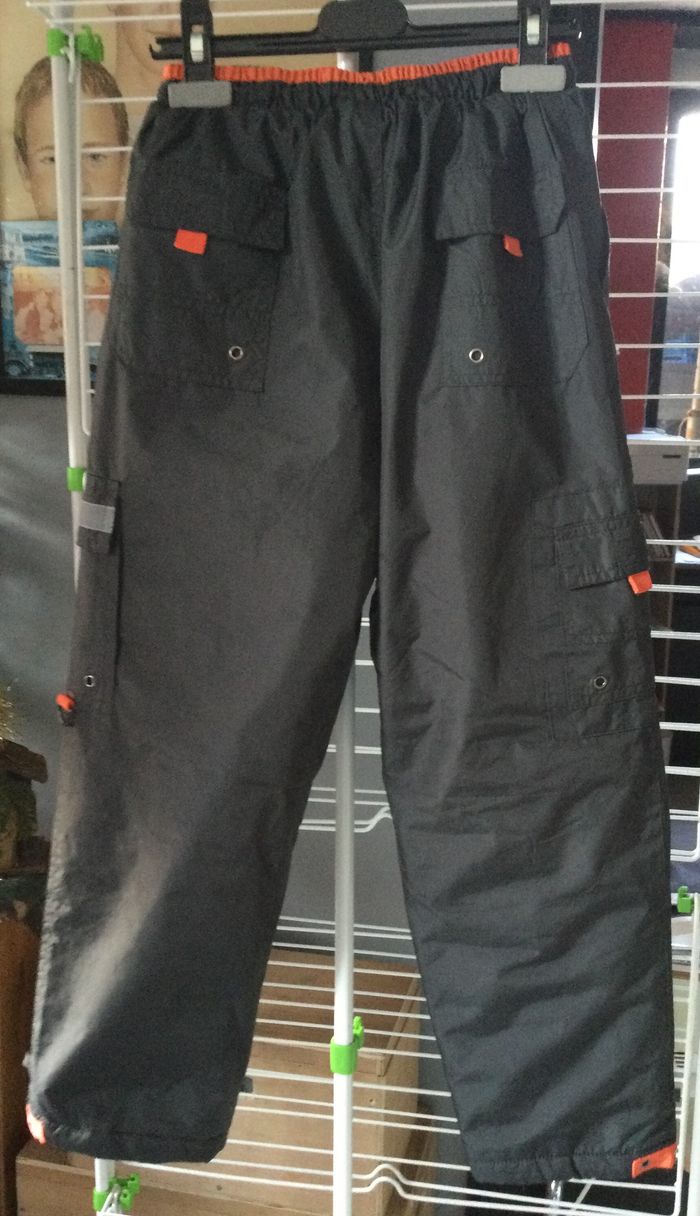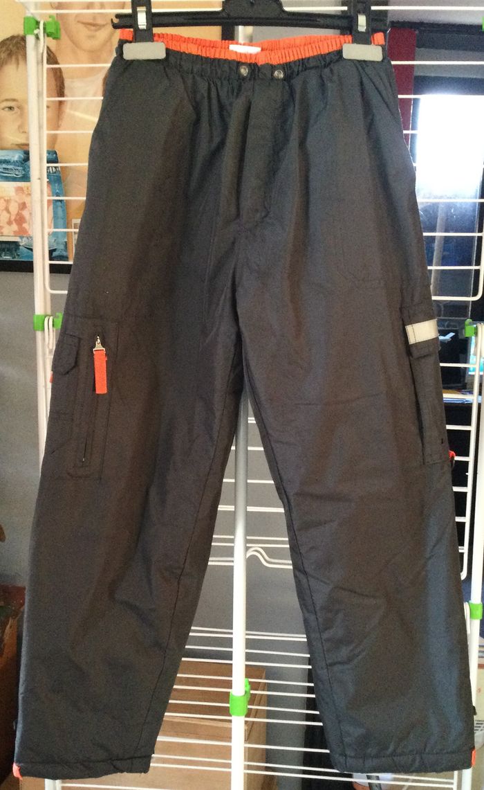 pantalon de ski enfant, gris et orange, taille 134 (8/9 ans), ceinture élastique, 100% polyester, manque élastique en bas des jambes(voir photo), 2 poches arrières, 2 poches avant et 12 poche de chaque coté des jambes. envoi rapide et soigné