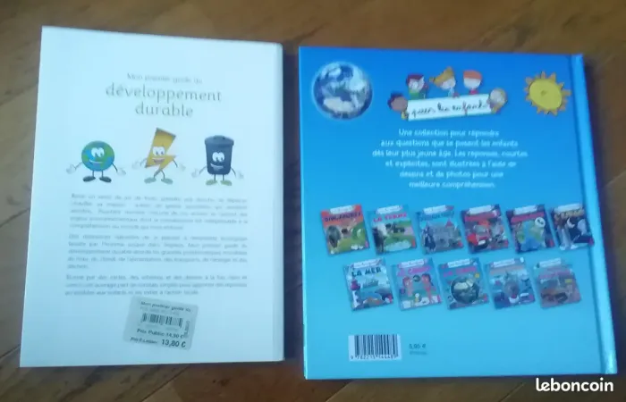 Bonjour, Je vous propose 2 superbes livresssur le thème de la terre et du développement durable. La terre ( pour les enfants) : Faire découvrir la Terre au travers des questions d'un groupe d'enfants : une approche ludique pour découvrir et comprendre. Très bon livre, avec de très belles images, ce livre est parfait pour un enfant curieux et qui se pose pleins de questions sur la terre. Le livre est facile à lire pour un enfant qui est dans l’apprentissage de la lecture ( à partir de 6 ans). Mon premier guide du développement durable : Mon premier guide du développement durable aborde les grandes problématiques mondiales de l'eau, du climat, de l'alimentation, des transports, de l'énergie et des déchets. Illustré par des cartes, des schémas et des dessins à la fois clairs et concis, cet ouvrage part de constats simples pour apporter des réponses accessibles aux enfants et les initier à l'action locale. ( à partir de 8 ans). Livres comme neuf ( idéal pour un cadeau). Envoi soigné possible via Mondial Relay ou la poste
