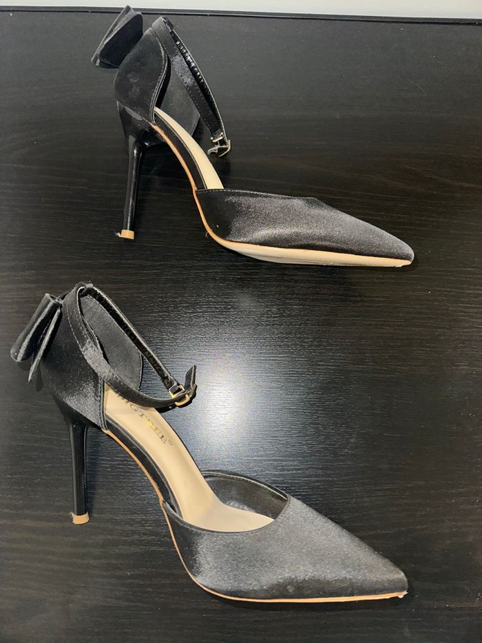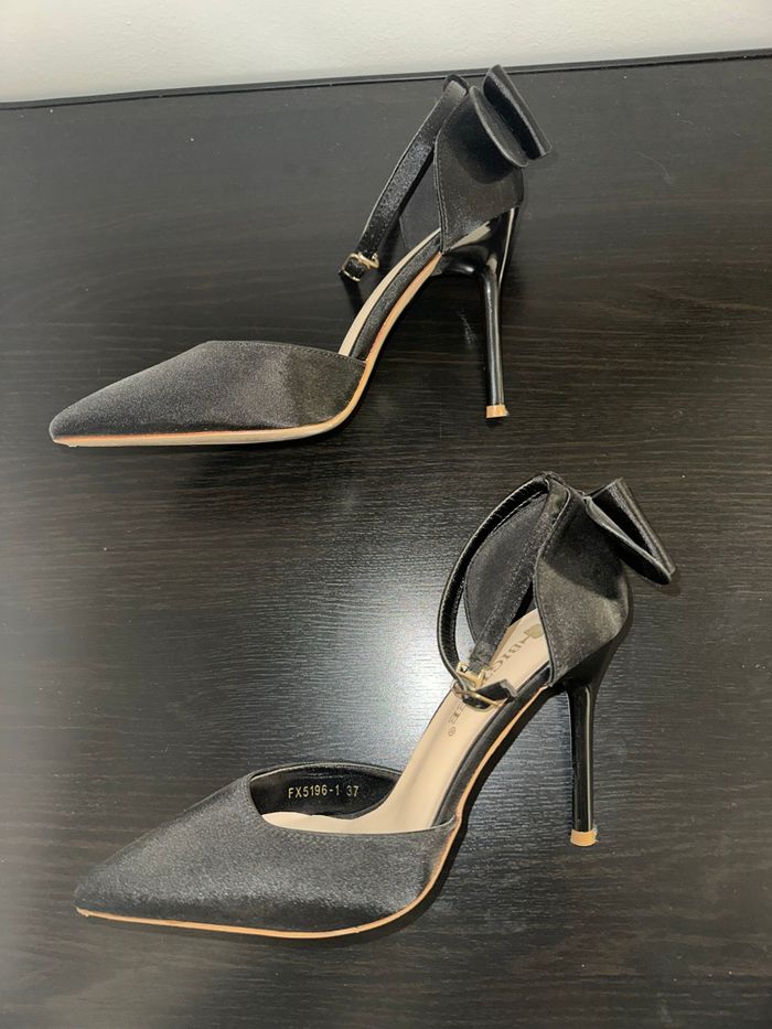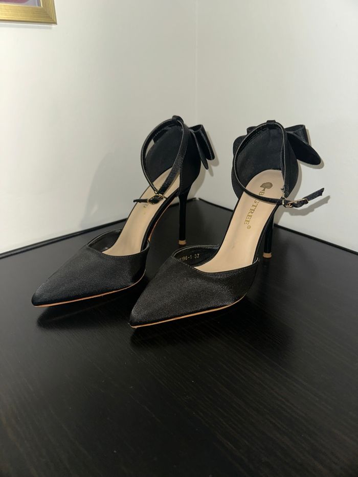 Escarpins - Excellent état - Pointure 37 - Couleur noire - Tissus satiné - Flot noeud à l’arrière - Talons 10cm