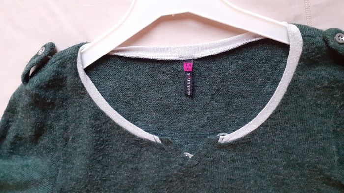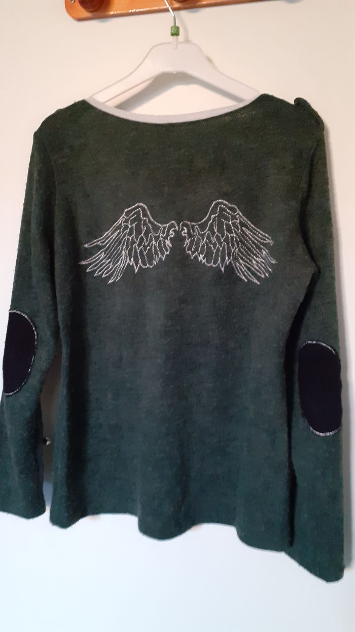 Vends un pull en maille 70 % acrylique, 30 % polyester, couleur vert foncé avec motifs blancs dans le dos, marque One&Unik, taille 4 ou XL. Longueur sous aisselle : 41 cm.