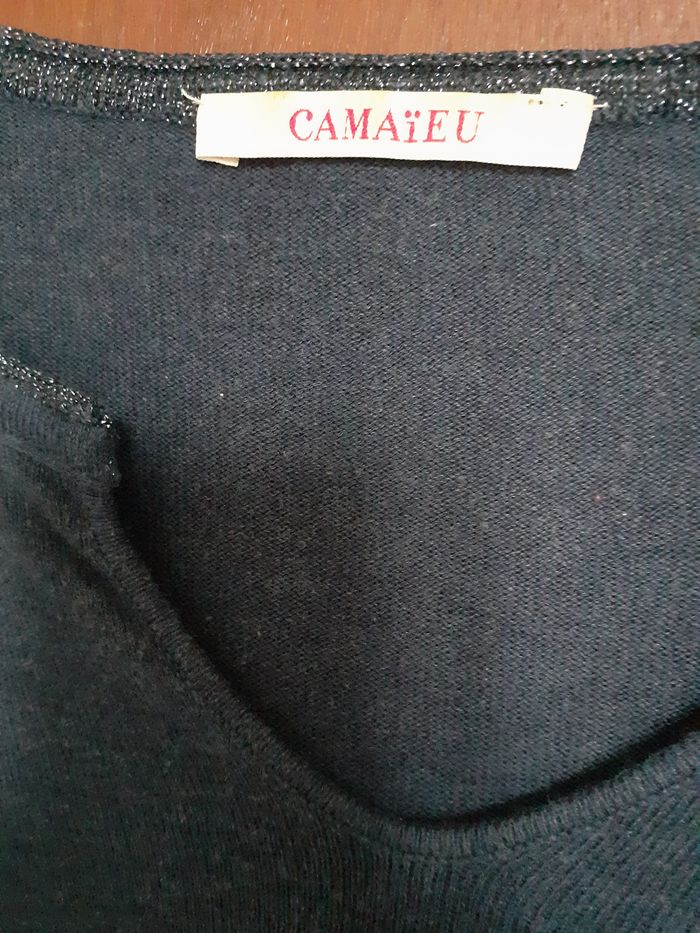 Vends un pull très fin 65 % viscose, 38 % coton, 1 % polyamide, 1 % métal, manches longues, fendu des 2 côtés, pan de derrière un peu plus long, couleur gris bleu brillant, marque Camaïeu, taille S. Longueur sous aisselle : 38 cm.