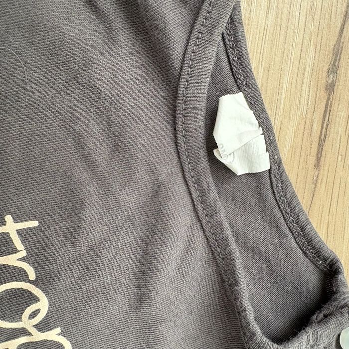 Joli haut gris foncé avec inscription “trop chou” et petit cœur. Boutons à l’épaule pour un enfilage facile. Marque inconnue (étiquette coupée). Très bon état.