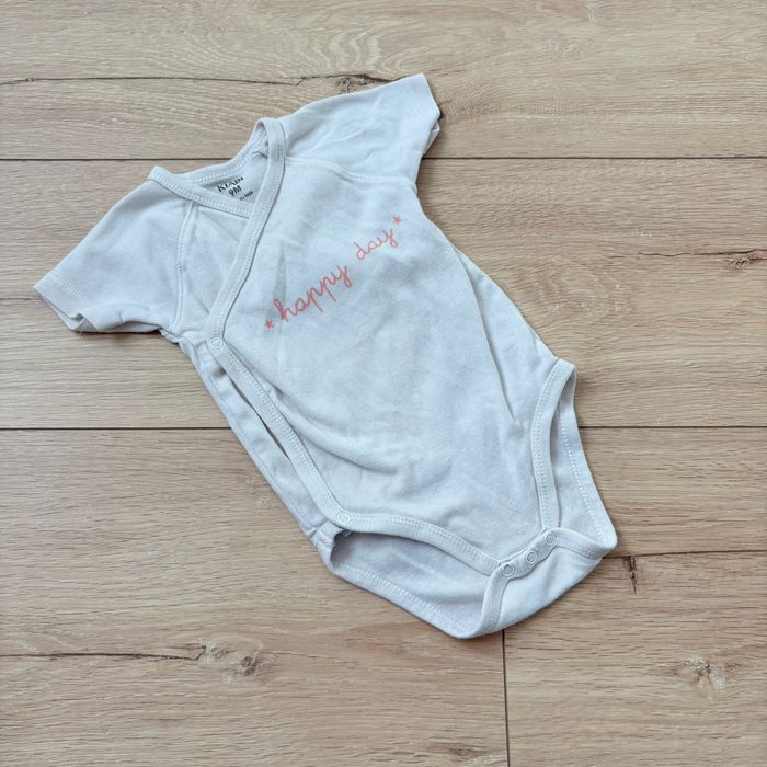 Body cache-cœur Kiabi 9 mois Blanc avec inscription « happy day » Pratique à enfiler grâce à l’ouverture cache-cœur, doux et confortable pour bébé. En très bon état, idéal pour le quotidien