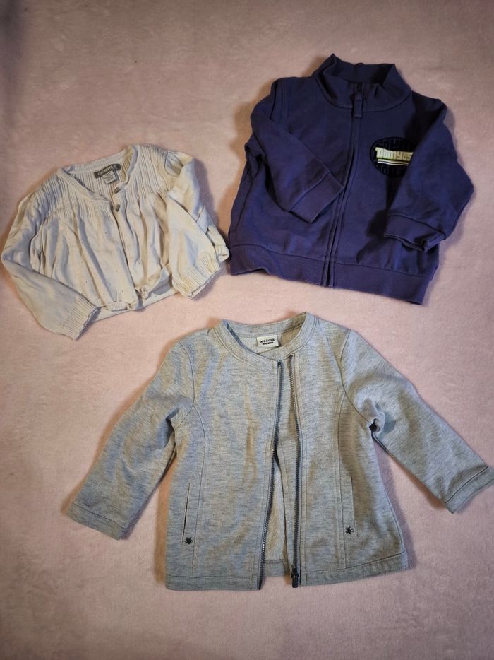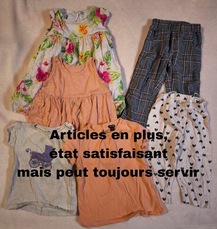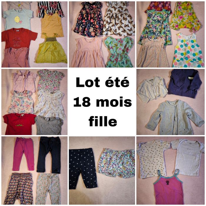 Lot 18mois fille été Comprenant: - 9 robes - 4 pantalons fins - 2 shorts (1 style legging et 1 style bloomer) - 13 hauts manches courtes - 3 hauts de corps - 3 gilets Les articles du lot sont en bon état très bon état. J'ajoute à ça les articles de la dernière photo qui sont en état satisfaisant mais ça peut toujours servir 😉