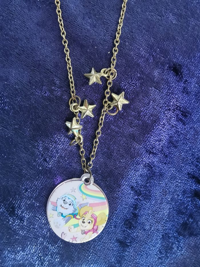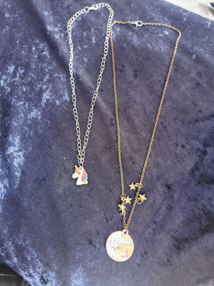 Lot de 2 collier pour fille licorne et Pat Patrouille, en bon état général, une légère oxydation sur les étoiles et le pendentif de Pat Patrouille est un peu marqué. Le lot n'est pas dissociable et comprend un collier licorne : chainette argentée avec pendentif en coutchoc, et un sutoir-chainette dorée avec les étoiles et le pendentif rond en plastique Pat Patrouille. Poids du lot fait 10g.