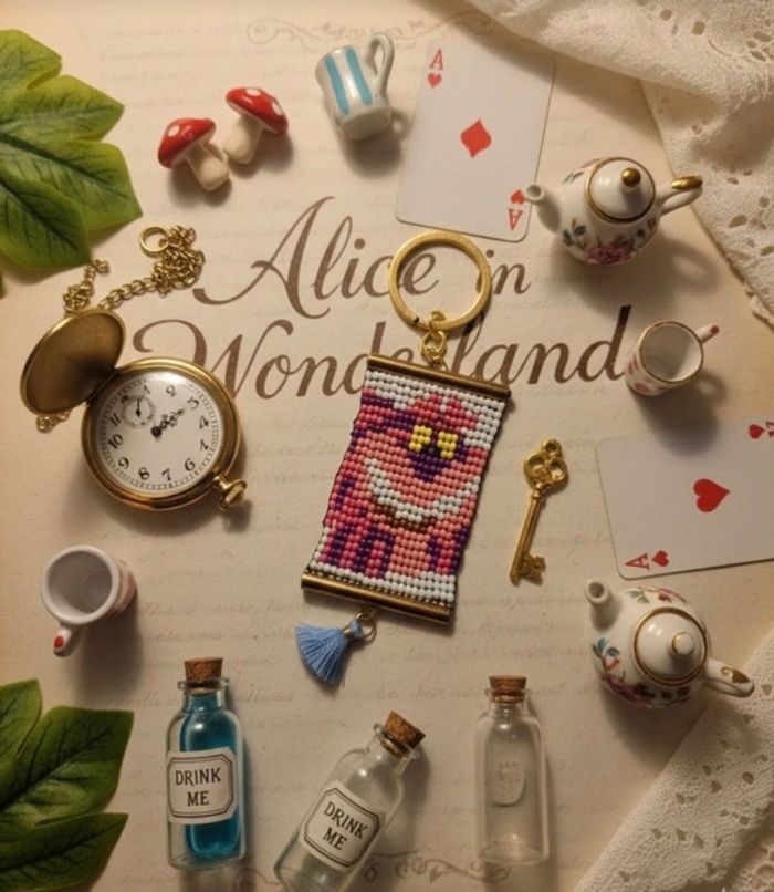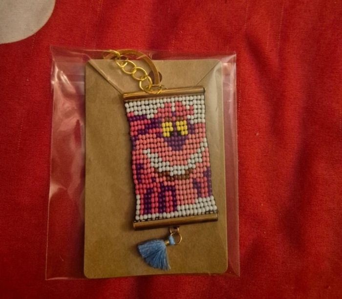 Vend ce joli porte-clés du chat chesire, d'Alice au pays des merveilles. Matériau perles miyuki 2mm deux, fermoirs coulissants et pompon bleu Non utilisé Tbe