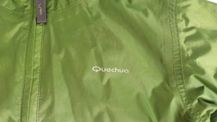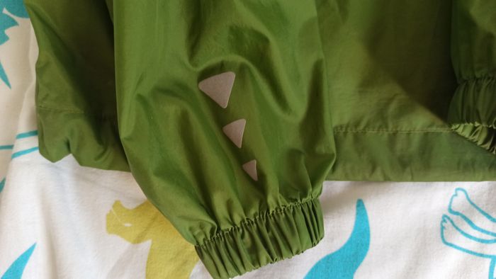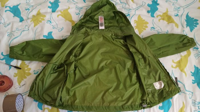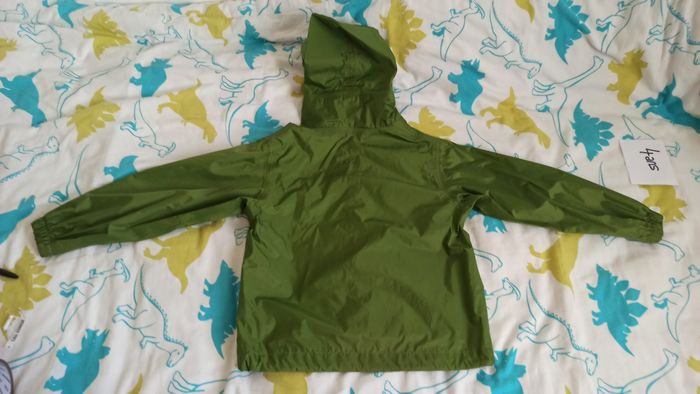Veste légère imperméable zippée à capuche / kway / coupe-vent 4 ans. Acheté chez Décathlon. Système d'accroche pour le plier. Motifs réfléchissants sur un poignée. Très peu utilisé.