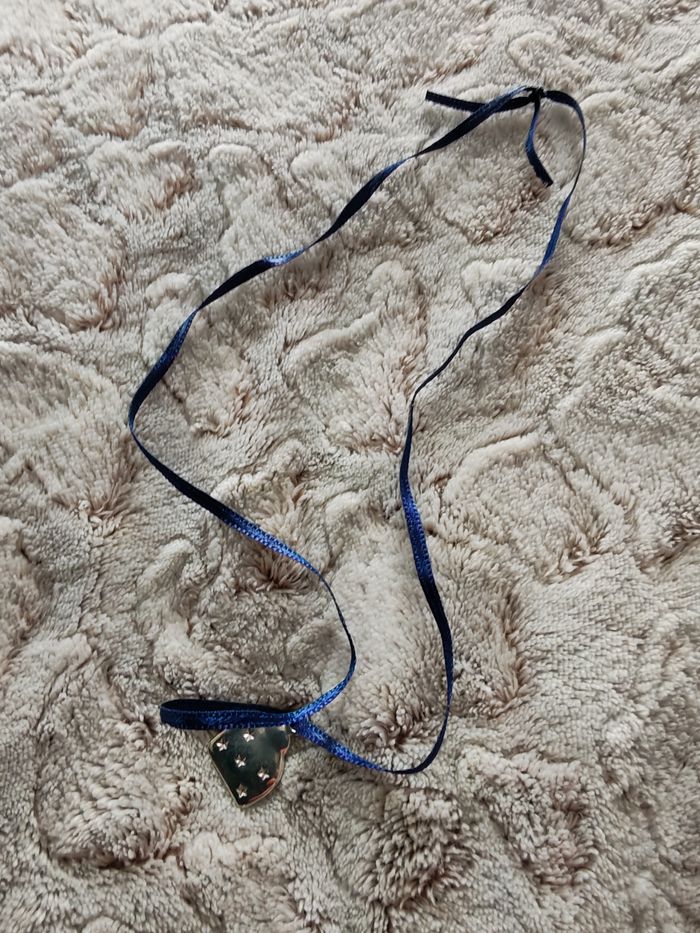 Sautoir ruban bleu marine avec le pendentif bourse argentée avec les étoiles, en très bon état général. Dimensions : Pendentif : 20x17 mm Ruban longueur (tour) : 58 cm Poids : 5g.