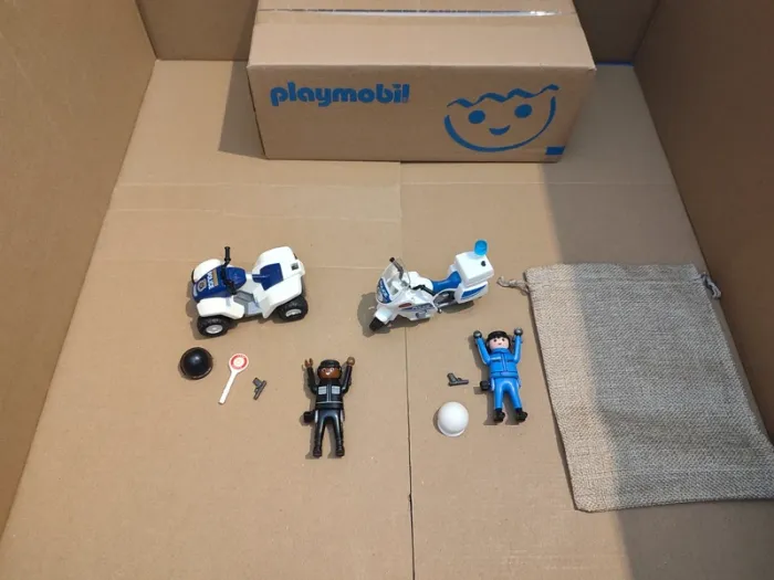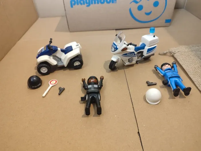 Lot playmobil Police contient 2 véhicules et 2 personnages 1 quad, guidon présent, mécanisme de propulsion fonctionne, roue arrière gauche a l'un des enjoliveurs endommagé mais cela ne remet pas en compte son maintien 1 moto, guidon et béquille présents, roule, sacoche arrière (le gyrophare ne s'allume plus). 2 personnages, 2 casques, 2 pistoles un panneau stop police Vendu dans un sachet en toile de jute, prêt à offrir
