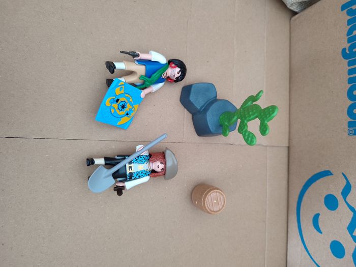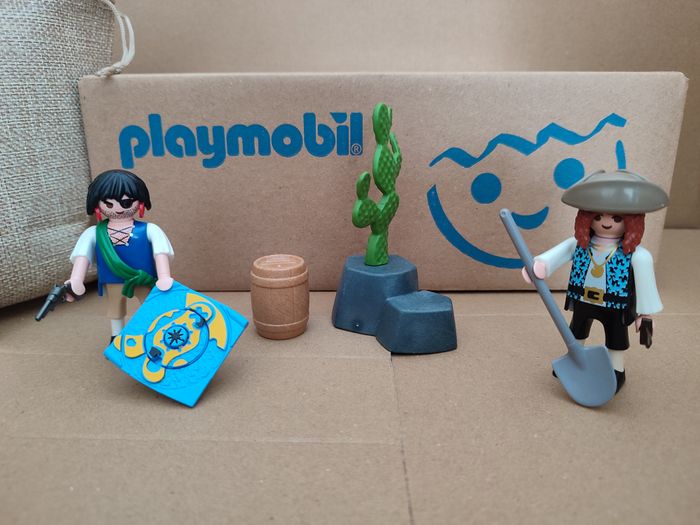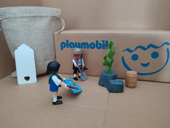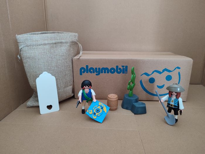 produit d'occasion inspiré du 4945 playmobil Lot composé de : 2 personnages pirates 1 carte au trésor 1 Revolver 1 pelle 1 poignard 1 chapeau 1 tonneau 1 caillou avec cactus 1 sac cadeau prêt a offrir
