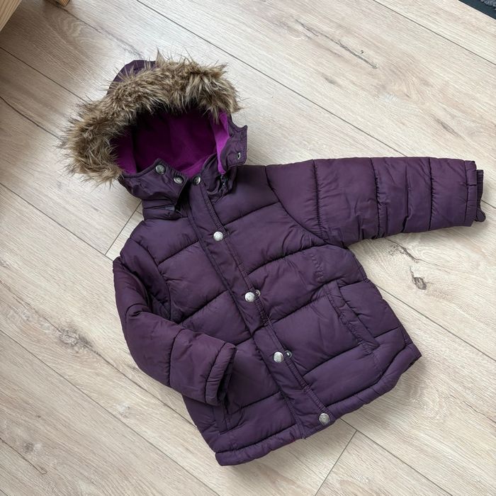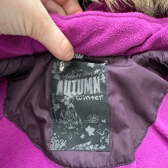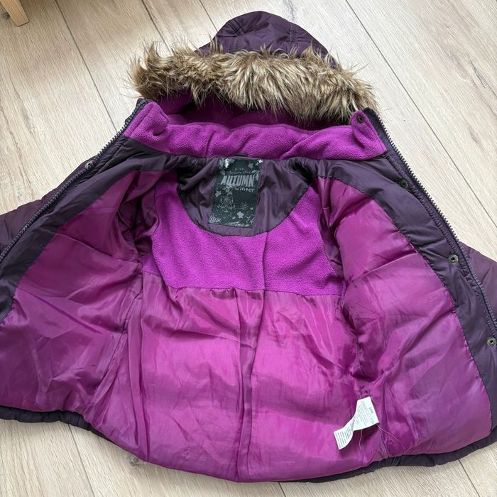 Marque : Kiss melody Girl Taille : 26 mois Couleur : violet / prune Capuche : oui, avec fausse fourrure Doublure : polaire violette Fermeture : zip + boutons pression État : bon état général À noter : quelques marques d’usure visibles (légères traces sur le tissu, petites zones frottées – voir photos). La doudoune reste chaude, fonctionnelle et propre, fermetures OK. Idéale pour la crèche ou les sorties d’hiver