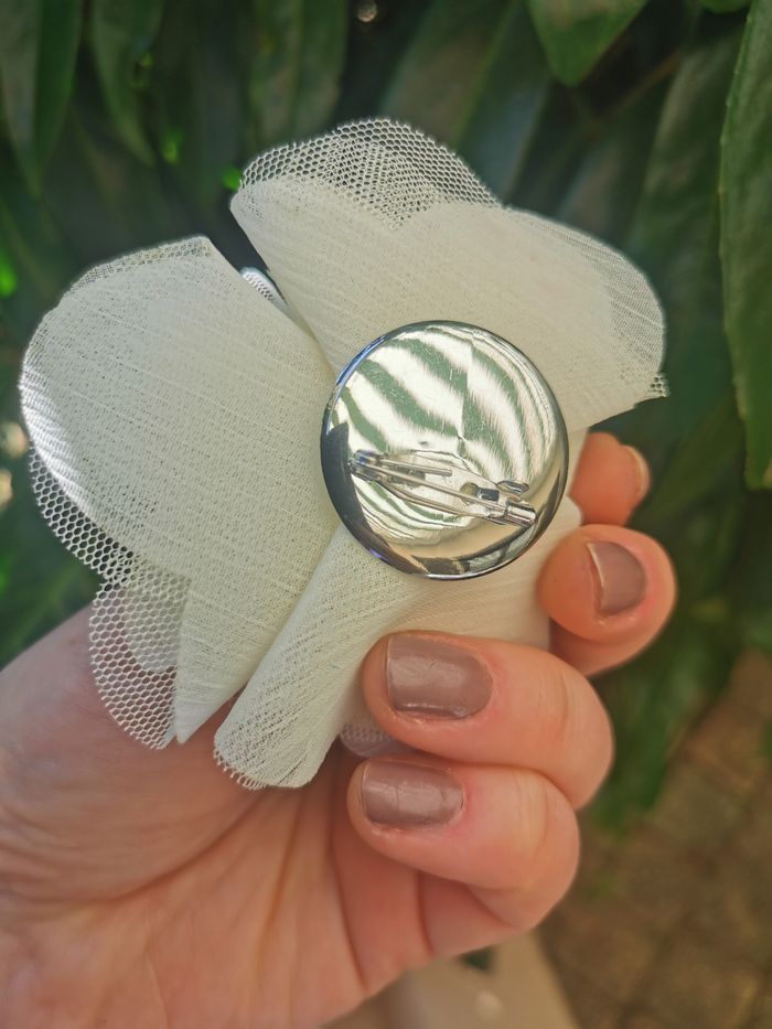 Broche fleur blanche en tulle et un autre tissu fin, centre en perles, couleur de la broche blanche écrue, en très bon état. Taille 8 cm, poids 6g.