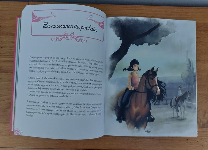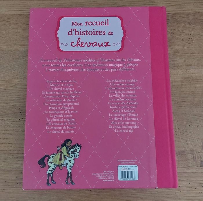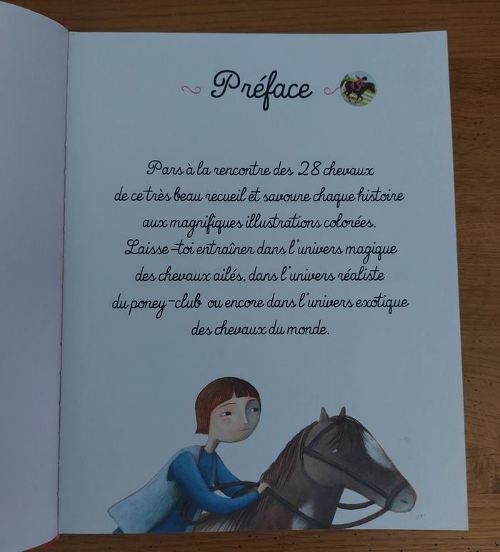 Mon recueil d'histoires de cheveaux Auzou Un recueil de 28 histoires inédites et illustrées sur les cheveaux, pour toutes les cavalières. Une invitation magique à galoper à travers des univers, des époques et des pays différents. Très bon état général excepté une page pliée voir sur la photo et quelques coins cornés