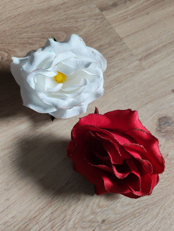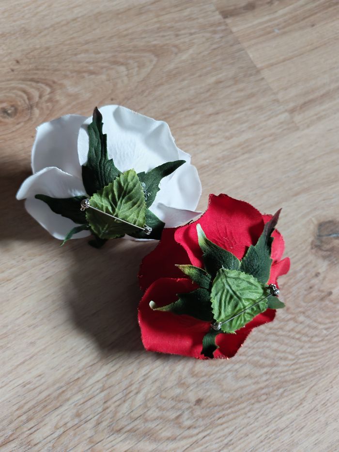 Lot de 2 broches fleurs rose rouge et blanche avec le liséré brillant, en très bon état, , les broches sont en tissu, le lot n'est pas dissociable, la taille d'une fleur fait 10x5 cm environ, le poids du lot 24g.
