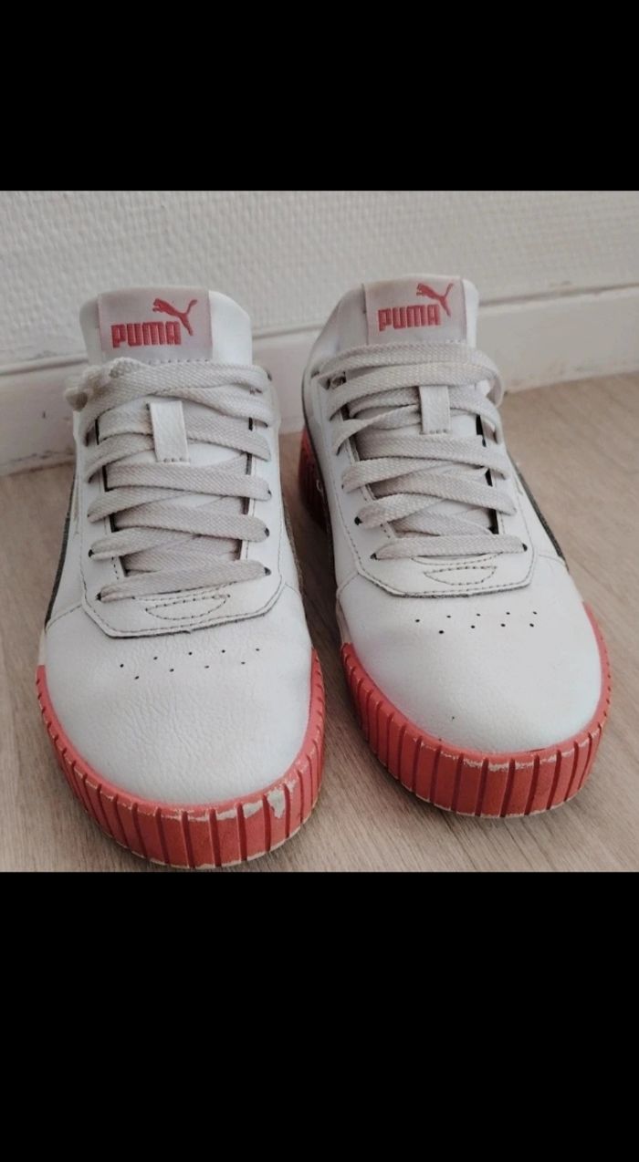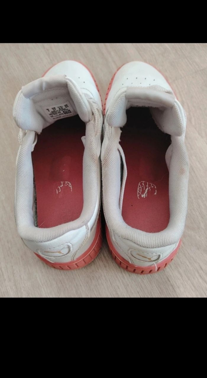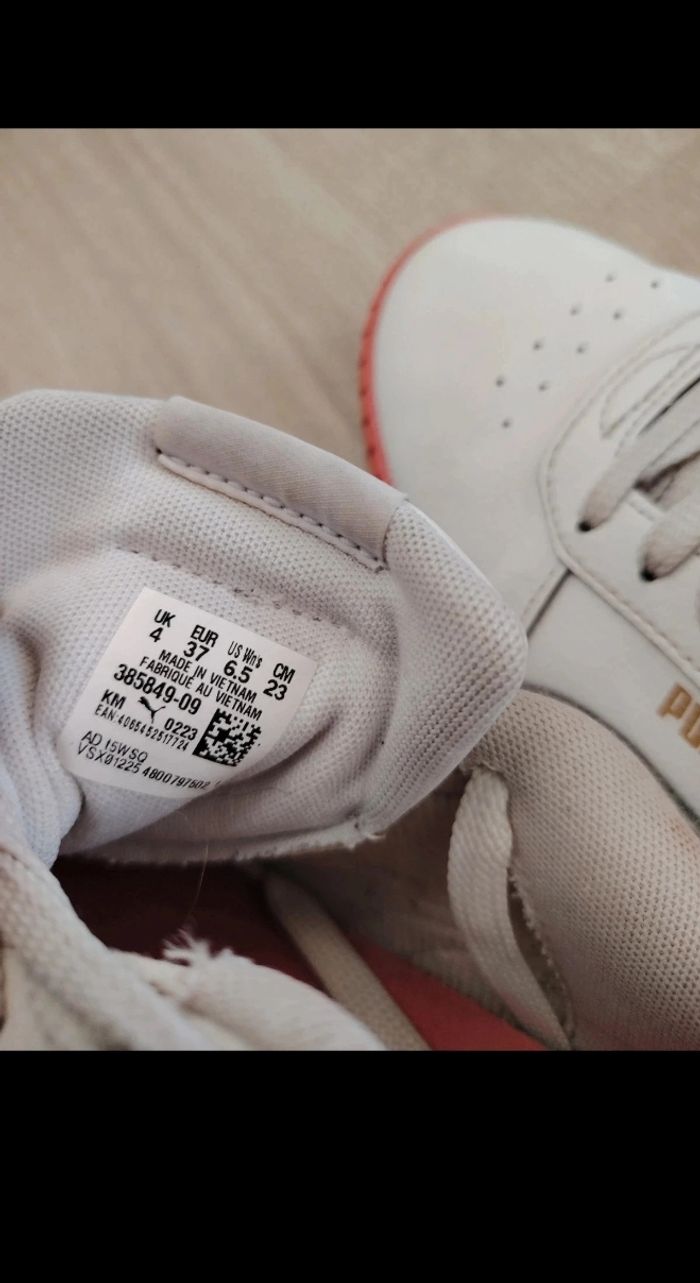 Je vends cette paire de baskets Puma originales en taille 37. C'est un modèle très mignon avec sa base blanche, ses détails roses sur la semelle et son logo doré.