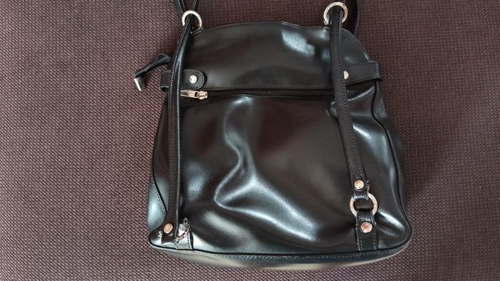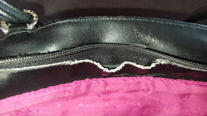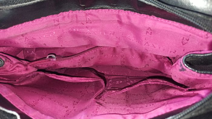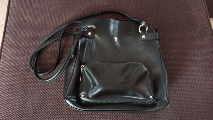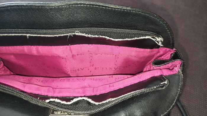 Sac à main en cuir noir de la marque Lancaster acheté aux Galeries Lafayette. Intérieur rose fushia. Beaucoup porté donc a des marques d'usure (bretelles abîmées, cuir ridé à certains endroits dont les coins, couture décousue au niveau de la fermeture éclair principale à l'intérieur : voir les dernières photos). Très pratique car peut se porter sur l'épaule ou sur le dos comme un sac à dos. Je l'ai eu une dizaine d'années mais il peut encore servir. J'ai repris exactement le même 🙂