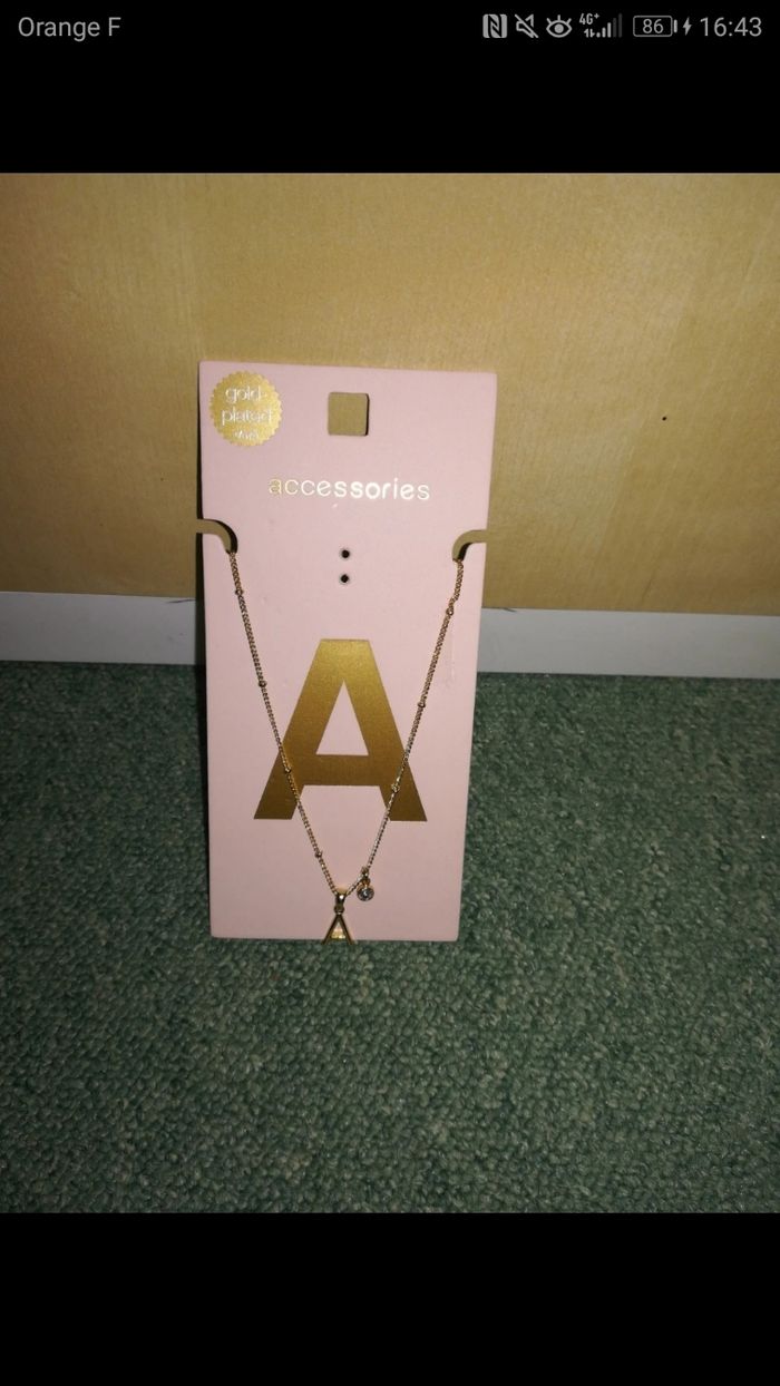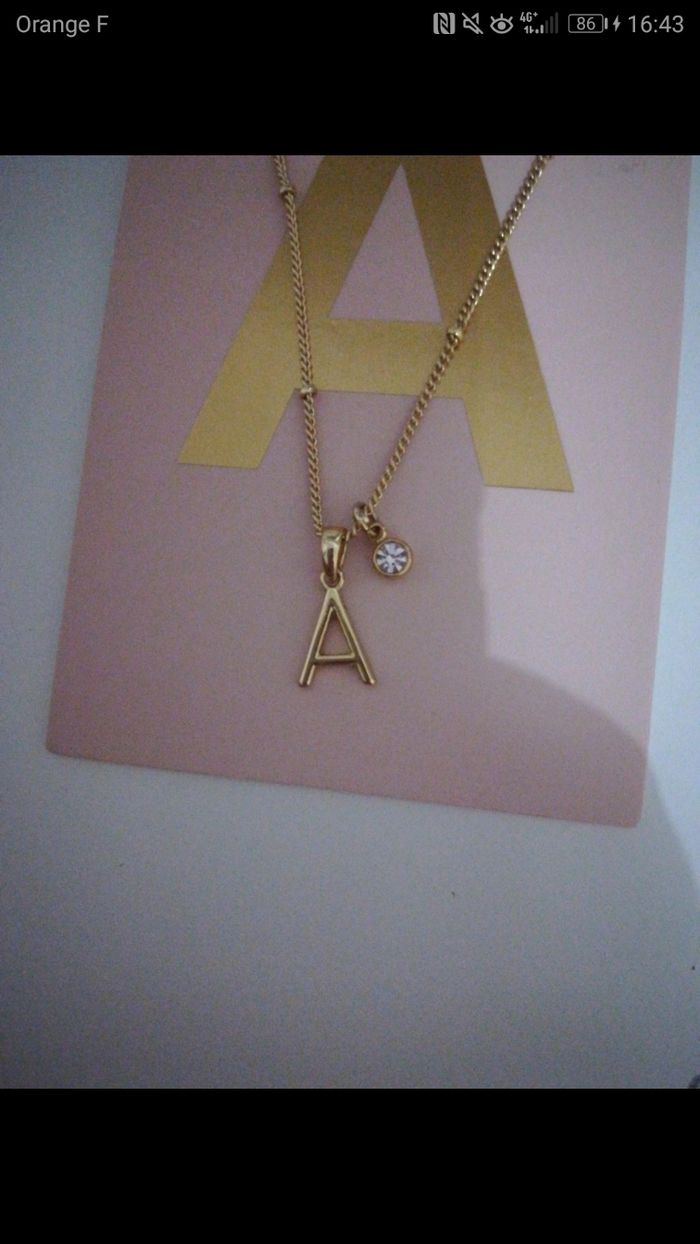 Joli collier doré plaqué or, lettre A et petit diamant, neuf avec étiquette