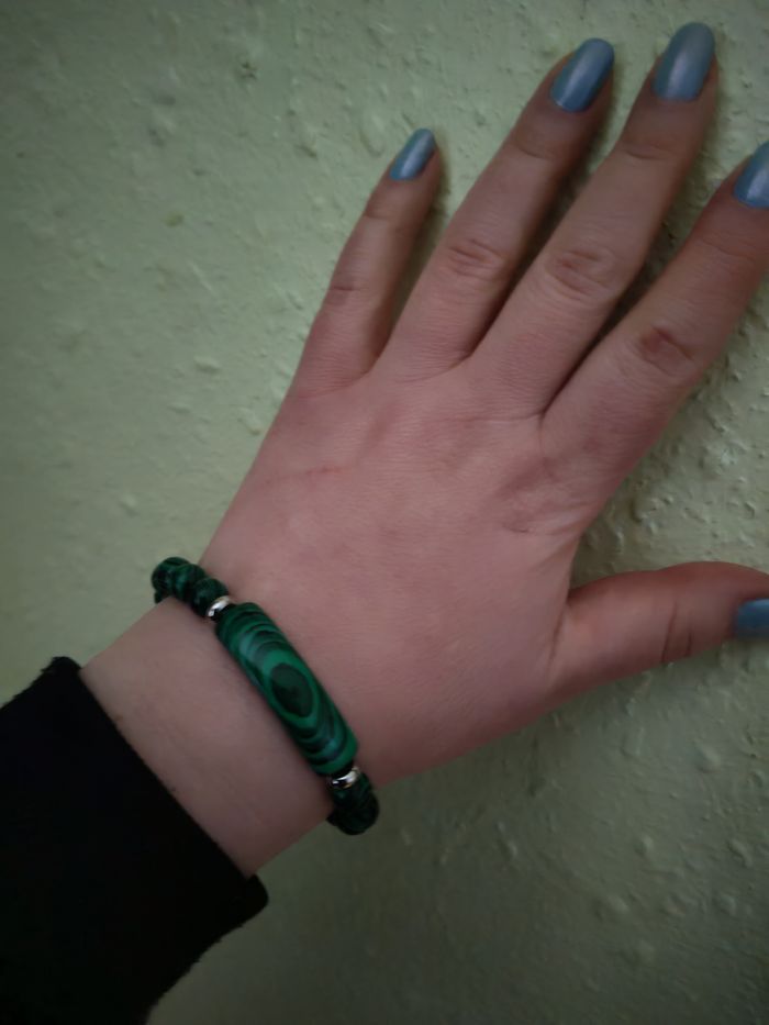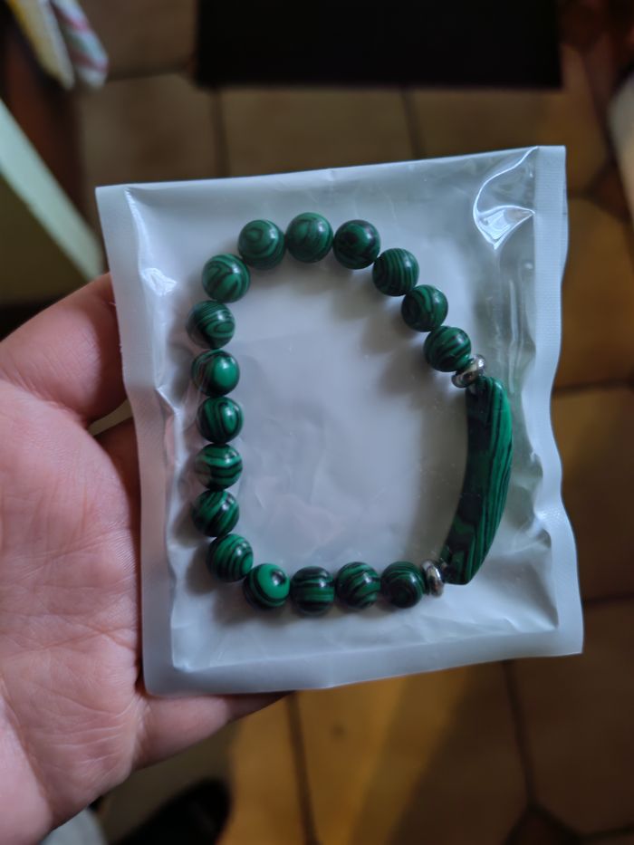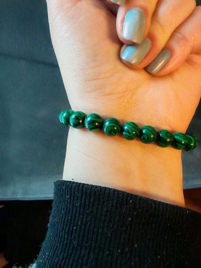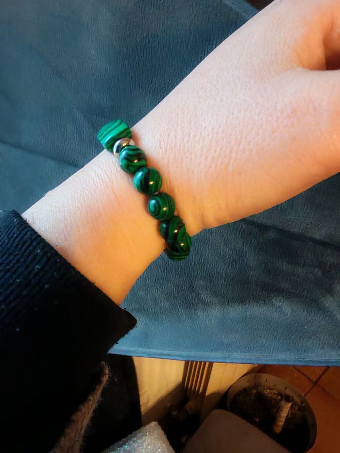 Bracelet vert en pierre malachite, neuf, dans son emballage. Bracelet sur un fil élastique, pour un poignet 18,5 cm maximum (poignet sur la photo fait 16 cm), le diamètre des perles pierres fait 8mm, avec 2 petites erles en métal argenté. Jolie bracelet, poids 18g.