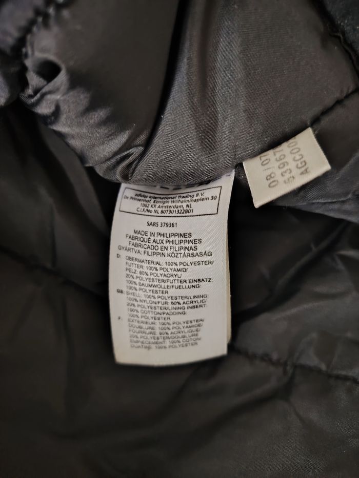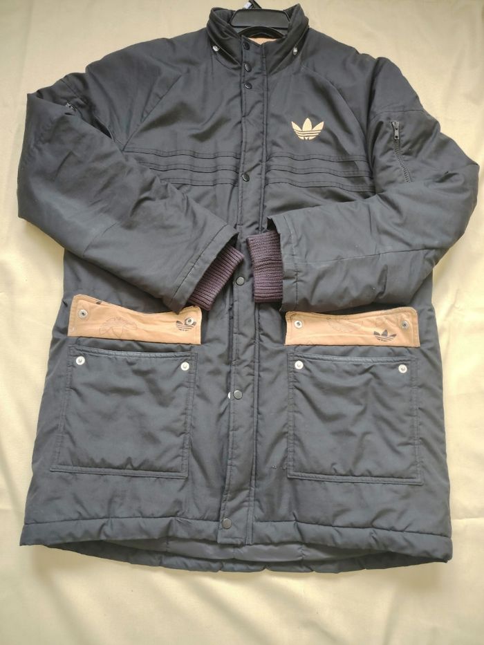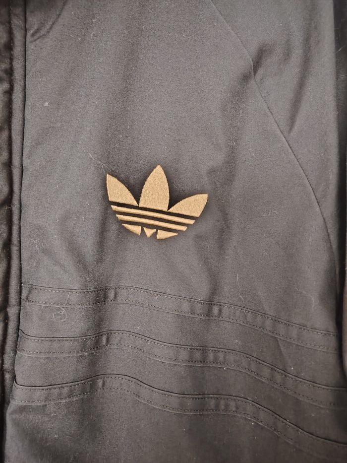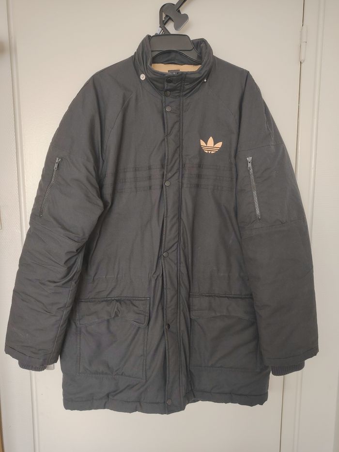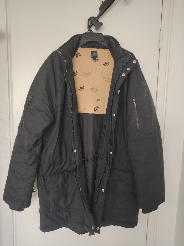Vends parka Adidas Originals noire avec logo trèfle doré brodé. Modèle chaud avec doublure intérieure beige et nombreuses poches pratiques. ​Taille : L ​Couleur : Noir / Intérieur Beige ​État : Bon état général. ​Défaut : Présence d'un petit accro en bas de la poche (voir photo zoomée), d'où le prix réduit. ​Envoi rapide assuré.