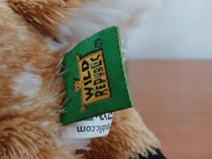 Doudou-Peluche entièrement rembourré; marque Wild Republic. Yeux en plastique et museau souple. Petites billes à l'intérieur du corps et du bout des pattes pour faciliter les positions debout et assise sur l'arrière-train. Hauteur maxi de 13,5 cm ; lavable à 30° // voir photos pour détails