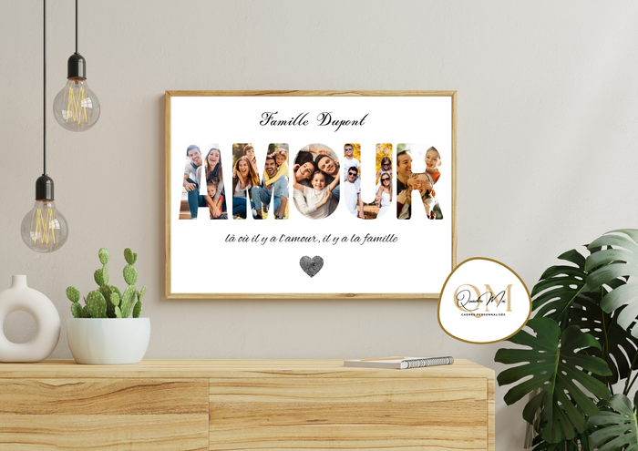 Cadre photo personnalisé, visuel créé sur mesure, cadre inclus. Thème Famille/Amour Vous avez le choix de : - Photos, - Texte, - En noir et blanc ou en couleur, - Couleur du cadre. Un aperçu vous sera envoyé pour vérification avant impression. Impression haute qualité sur papier photo brillant. Formats disponibles : A4 - 16,99€ A3 - 25,99€ Envoi du fichier par mail : 12€ Remise en main propre possible sur les secteurs Valenciennes/Maubeuge (59). Article personnalisé, pas de retour / pas d’annulation possible une fois la commande réalisée.