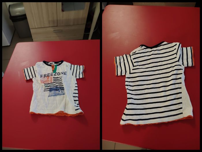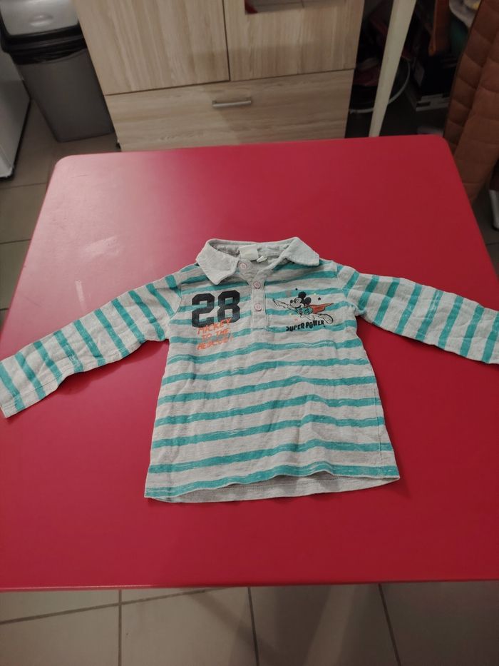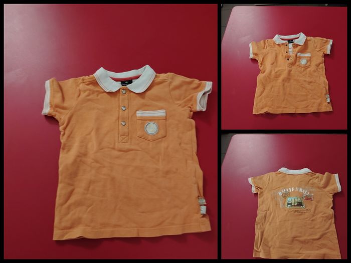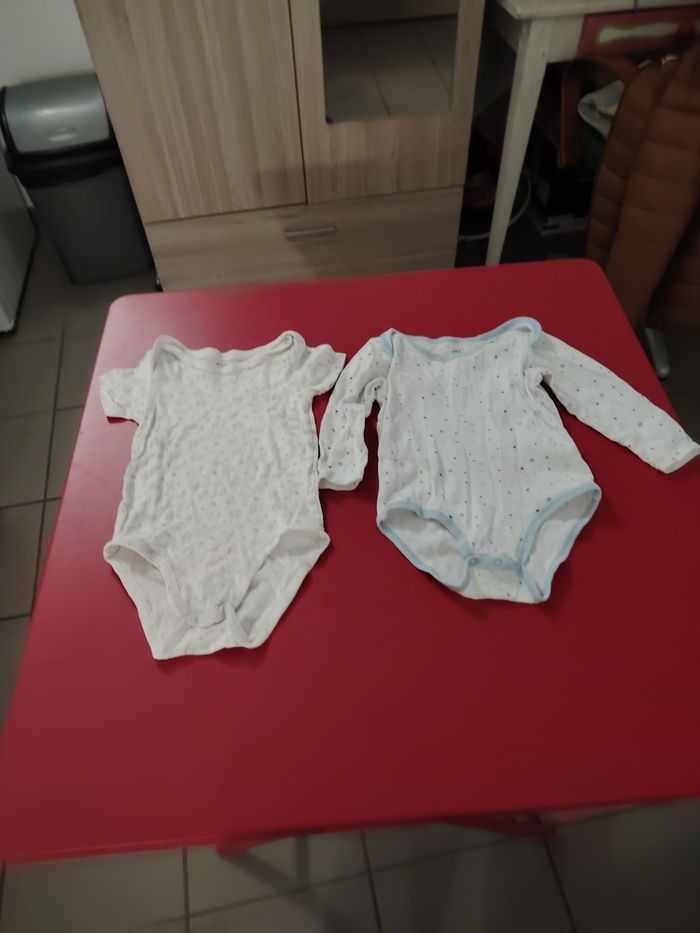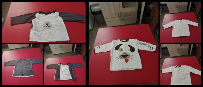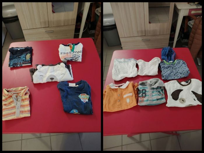 2 teeshirt avec un col et 3 boutons à pression et 1 avec des boutons mes pas à pression plus 1 teeshirt a manche longue avec un col et 2 teeshirt normale sans col et sans boutons et un autre avec une ne capuche et 2 boutons à pression et 2 autre sweeat avec 3 bouton deriere plus 2 body un à manche longue et un a manche courte pour plus de détails nesiter pas a regarder les photos prix 5€