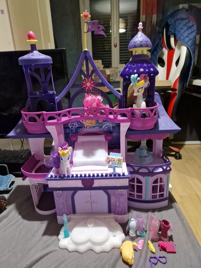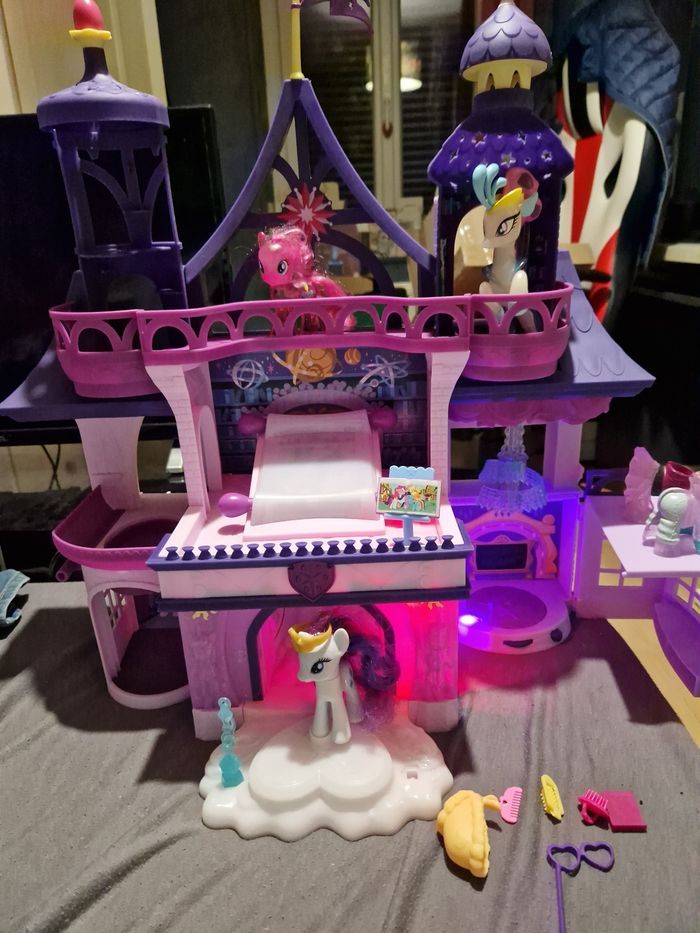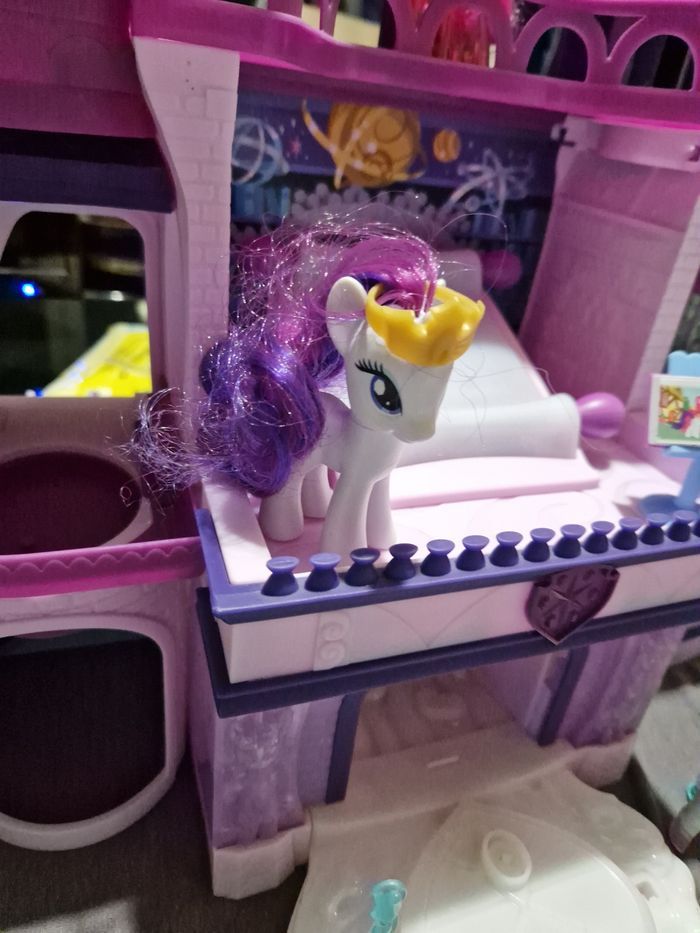 Bonjour je vend ce château my little pony Le château son et lumière Vendu avec poneys et accessoires Il manque juste une petite pièce de déco du château sur le devant qui n empêche en rien le bon fonctionnement. Reste en bon état