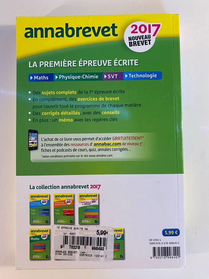 Livre Annabrevet édition 2017, spécialement conçu pour préparer la première épreuve écrite du Brevet. Il contient 75 sujets corrigés couvrant les matières principales : Maths, Physique-Chimie, SVT et Technologie, ainsi qu’un mémo du brevet avec les repères essentiels à connaître. Les corrigés sont détaillés et accompagnés de conseils méthodologiques pour progresser efficacement. Idéal pour les révisions, l’entraînement en conditions d’examen ou comme support complémentaire tout au long de l’année. Neuf.