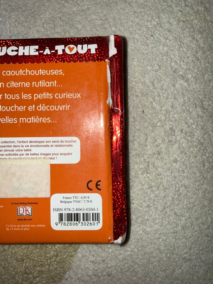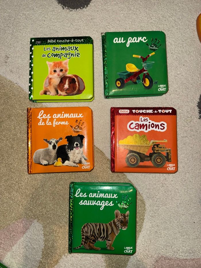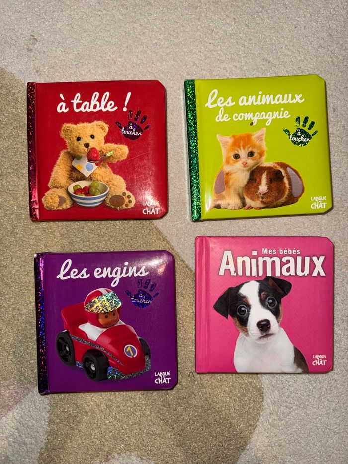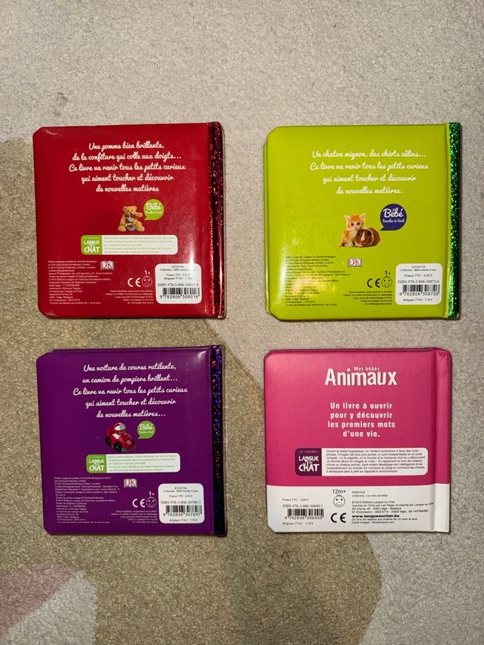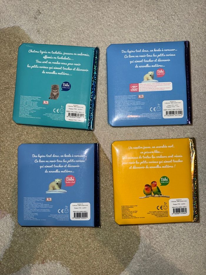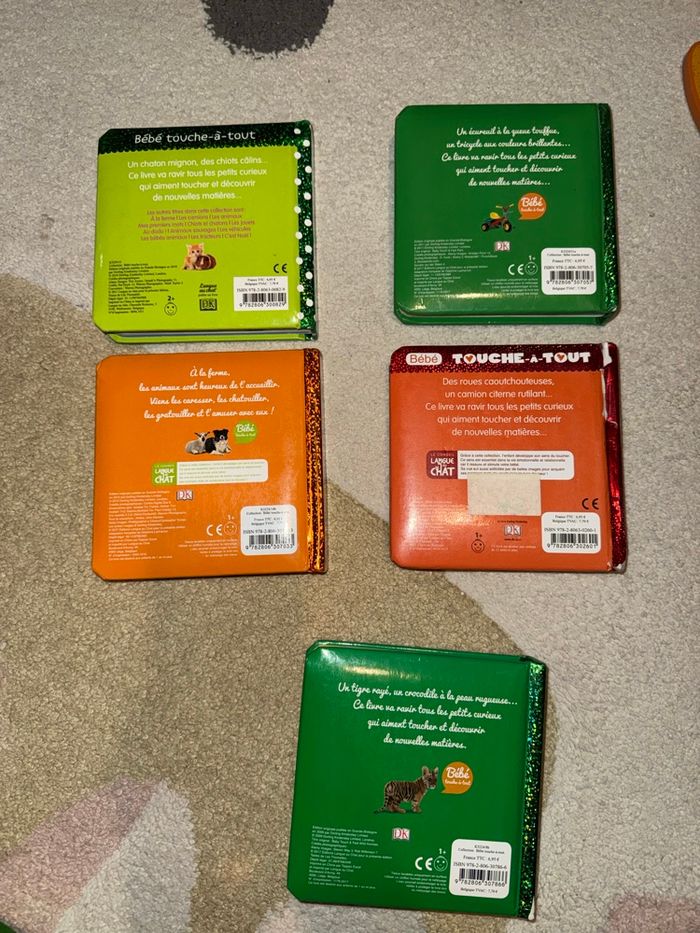 Certains un chouïa plus abîmés que d’autres 14 livres à toucher Les animaux sauvages Les camions Mes bébés animaux À table Les animaux de la ferme Les animaux câlins (x2) Les animaux colorés Au parc Les animaux de compagnie (x2) Noël Les engins Les chatons