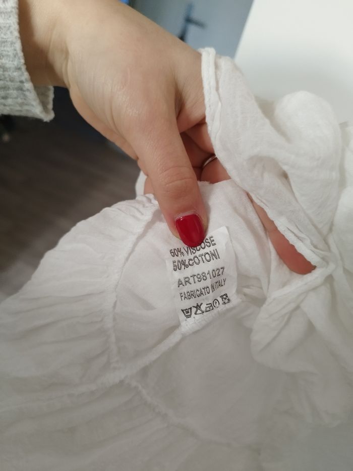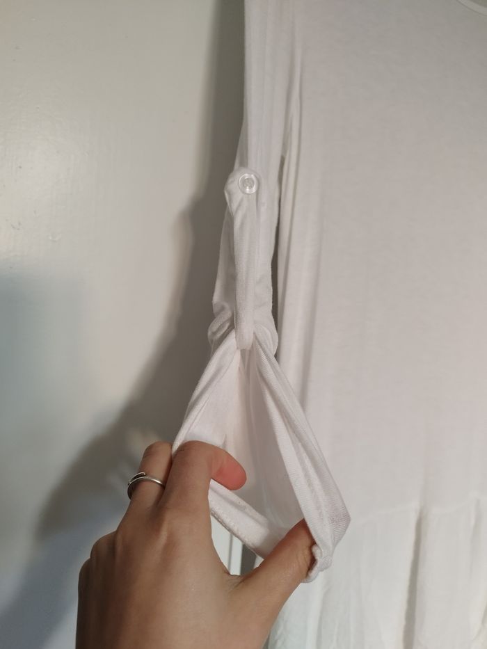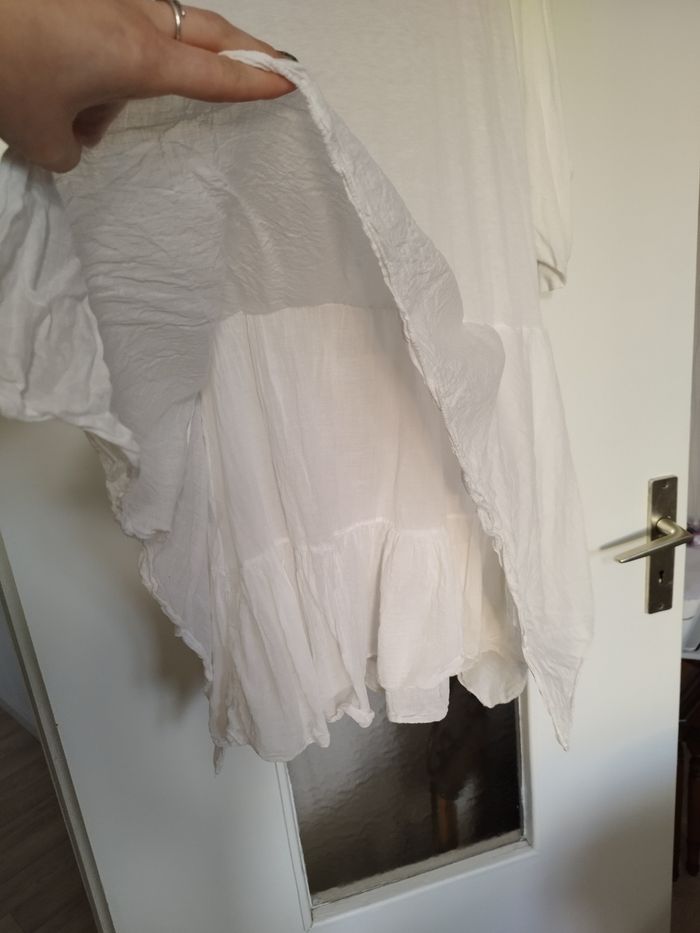 Peut se porter séparément. Très joli, léger. Il y a un deuxième volant sur la robe en bas (mit en photo), sur les manches il y a un petit bouton. Très élégant.