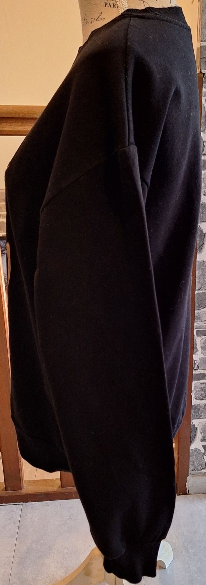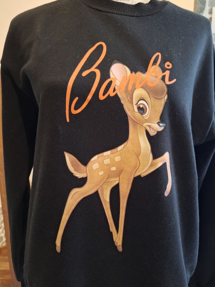 En coton et polyester, pull noir avec un grand imprimé Bambi devant. Bien chaud.