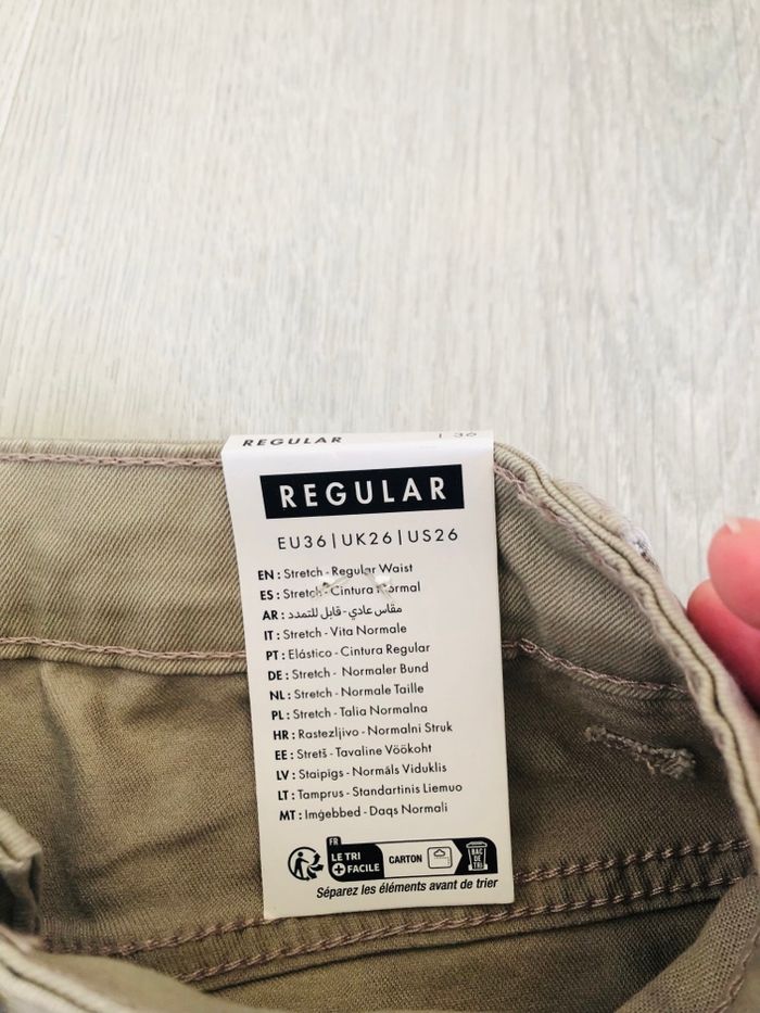 Pantalon femme Coupe regular Taille 36 S État : neuf Ce pantalon femme est confectionné dans une matière extensible et twisté par des surpiqûres fantaisie au niveau des poches. A porter en version chic avec une chemise ou une blouse, comme en version cool avec une tee-shirt ou un sweat. Caractéristiques Nombre de poches exterieures : 5 Type de longueur : Long(ue) Longueur d'entrejambe (en cm) : 78 Type de fermeture : Glissière + Bouton Type de coupe bas : Regular 67% COTON 30% POLYESTER 3% ELASTHANE Pantalon coupe Regular taille normale femme beige fonce