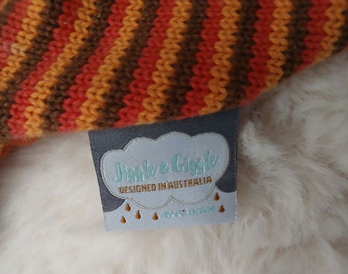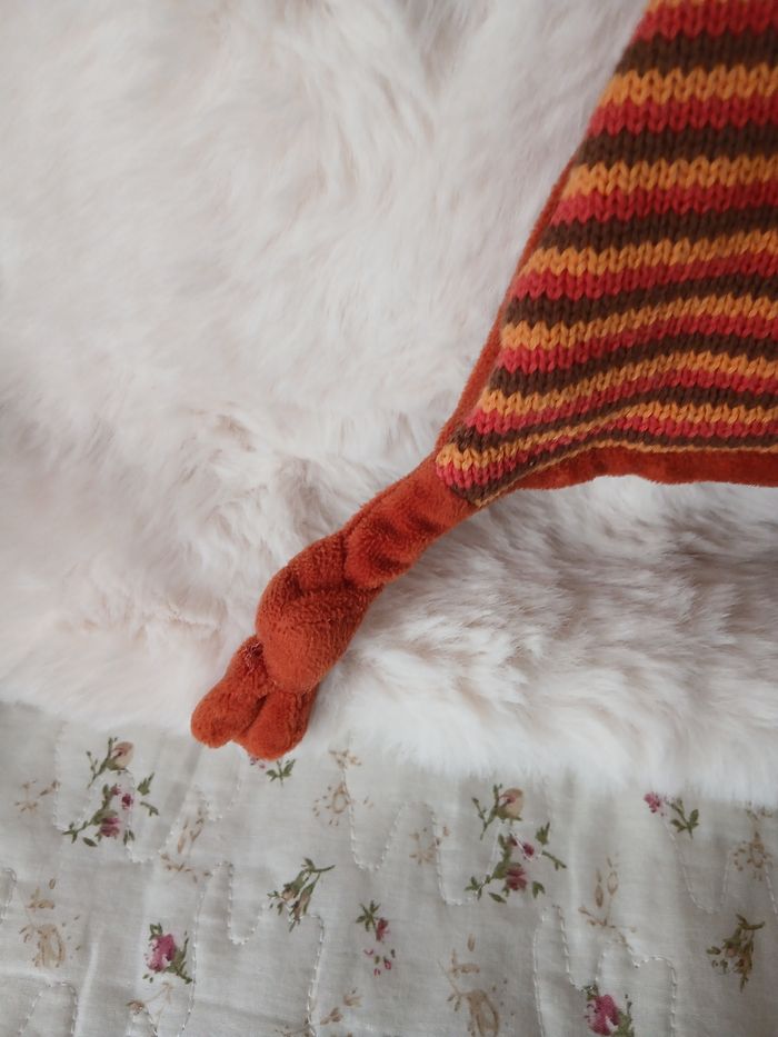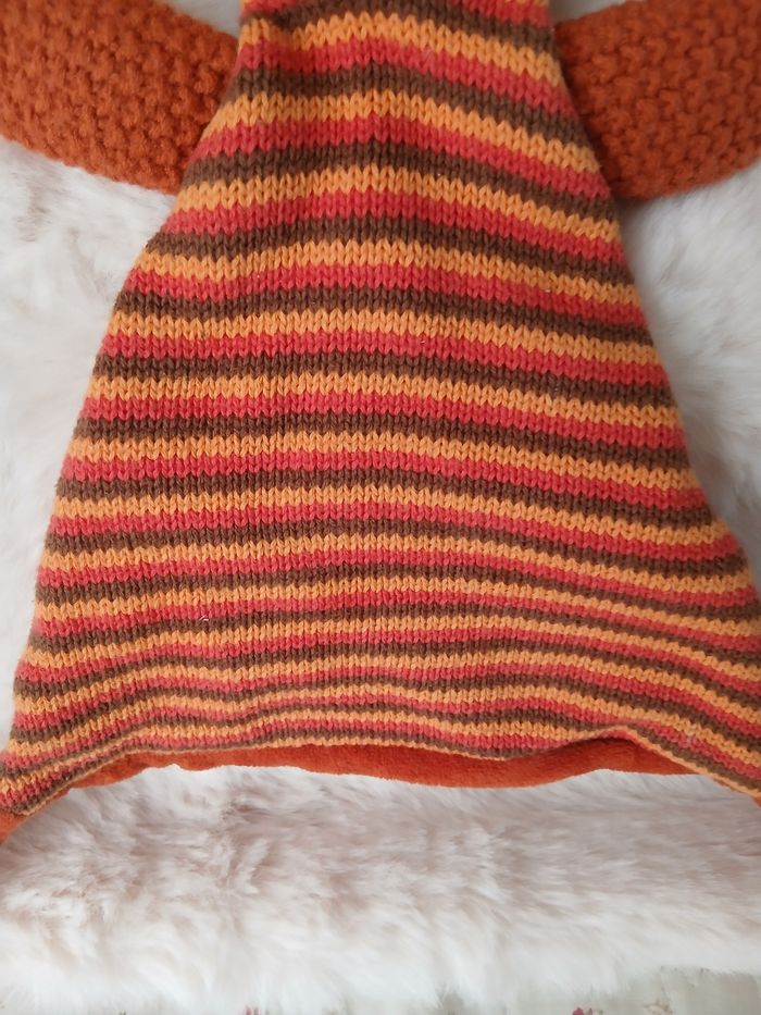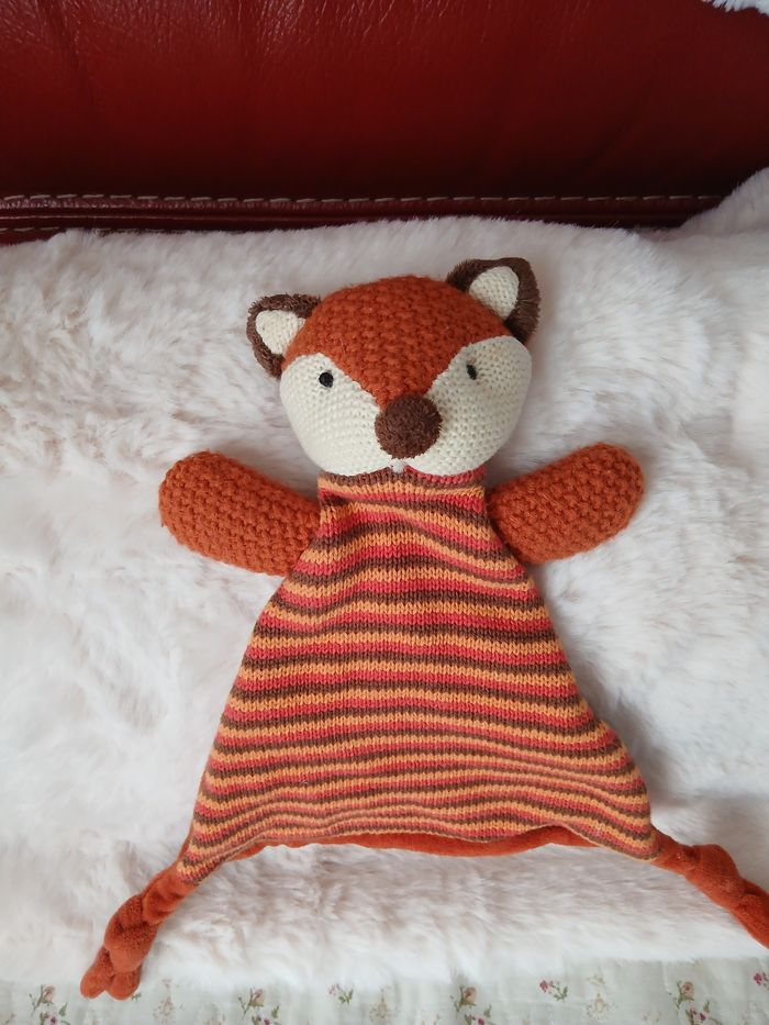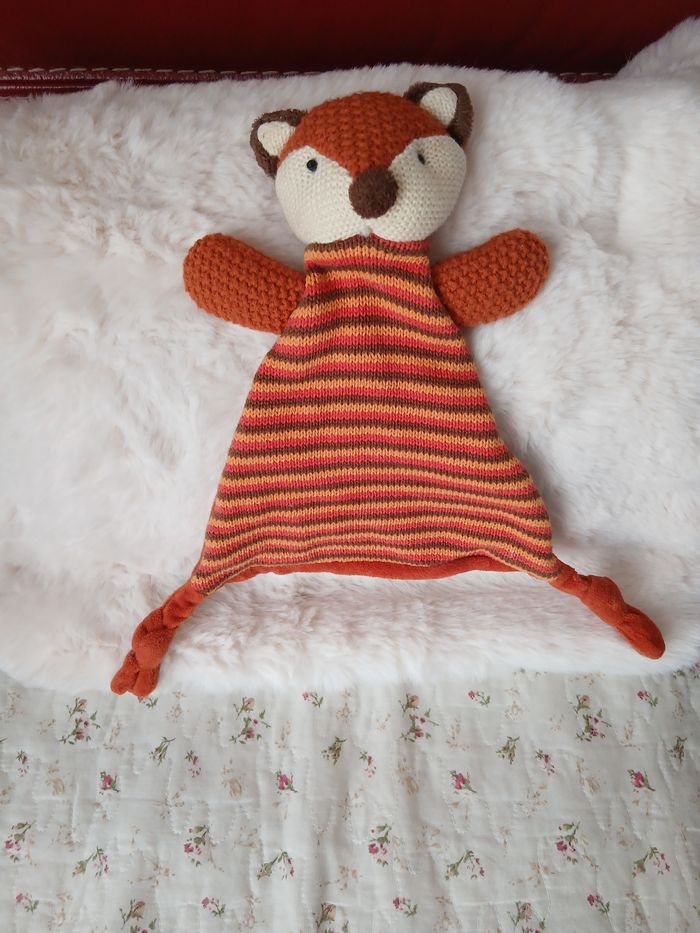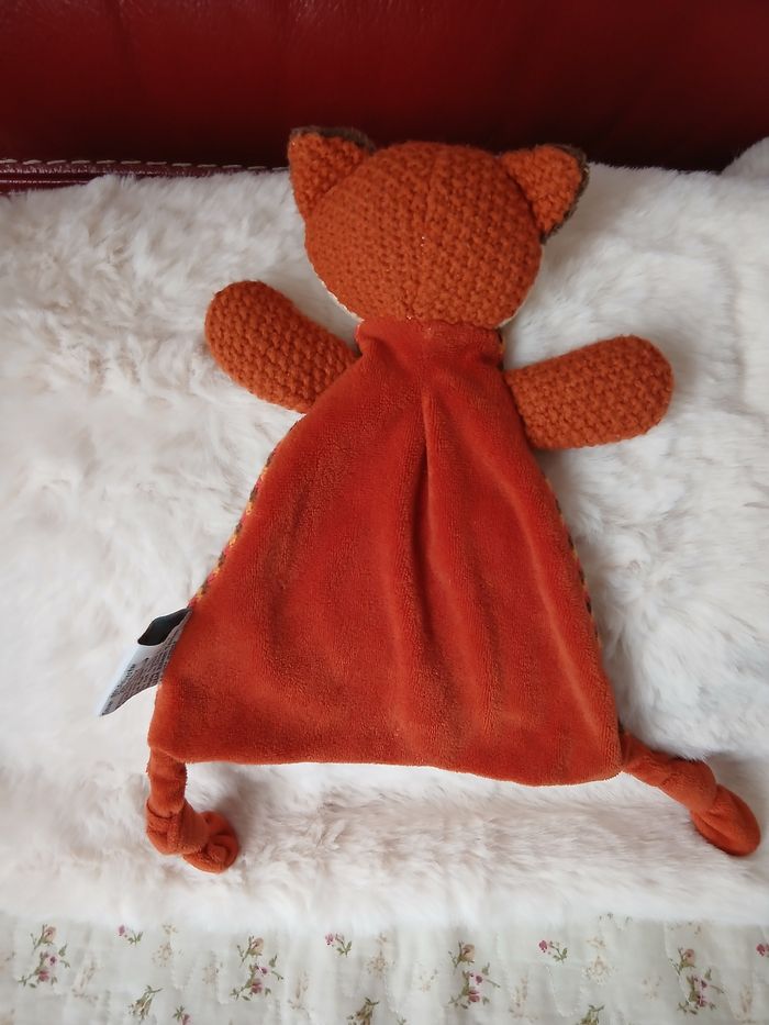 Doudou Petit Renard avec tête et pattes avant rembourrées. Doudou en tricot [ laine synthétique/ plusieurs points de tricot] et tissu velouté. Pattes arrières à mâchouiller. Hauteur maxi de 23,5cm ; lavable à 30° // voir photos pour détails