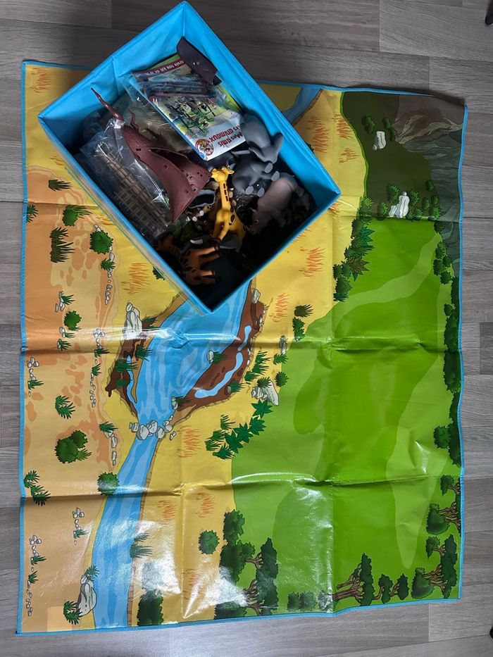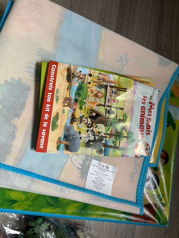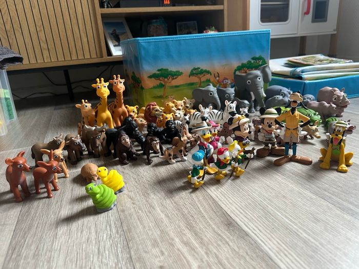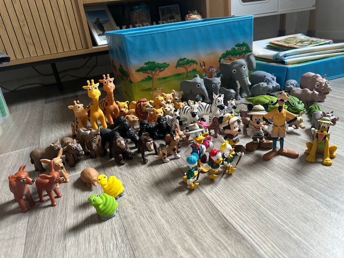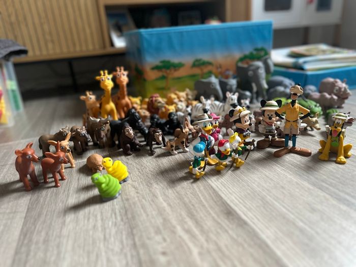 Grand lot de figurines Disney issues de la collection Mes amis les animaux (Hachette). Comprend de nombreuses figurines d’animaux (savane, jungle, ferme…) ainsi que des personnages Disney en tenue d’explorateur : Mickey, Donald, Daisy, Dingo. Le lot comprend également : • le grand tapis décor (savane) • des arbres / éléments de décor neufs, encore emballés Figurines vendues sans les livres. Ensemble en bon état général, propres, ils n’ont jamais été utilisé.