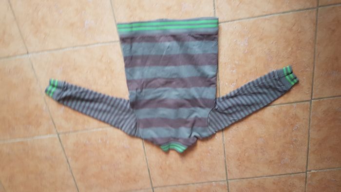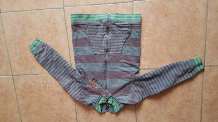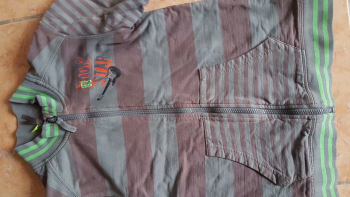Gilet polaire garçon Taille 10 ans Couleur marron à ligne kaki et verte Manches longues 2 poches ventrales Ecusson Rock star à la poitrine Très chaud Fermeture éclair Marque Orchestra