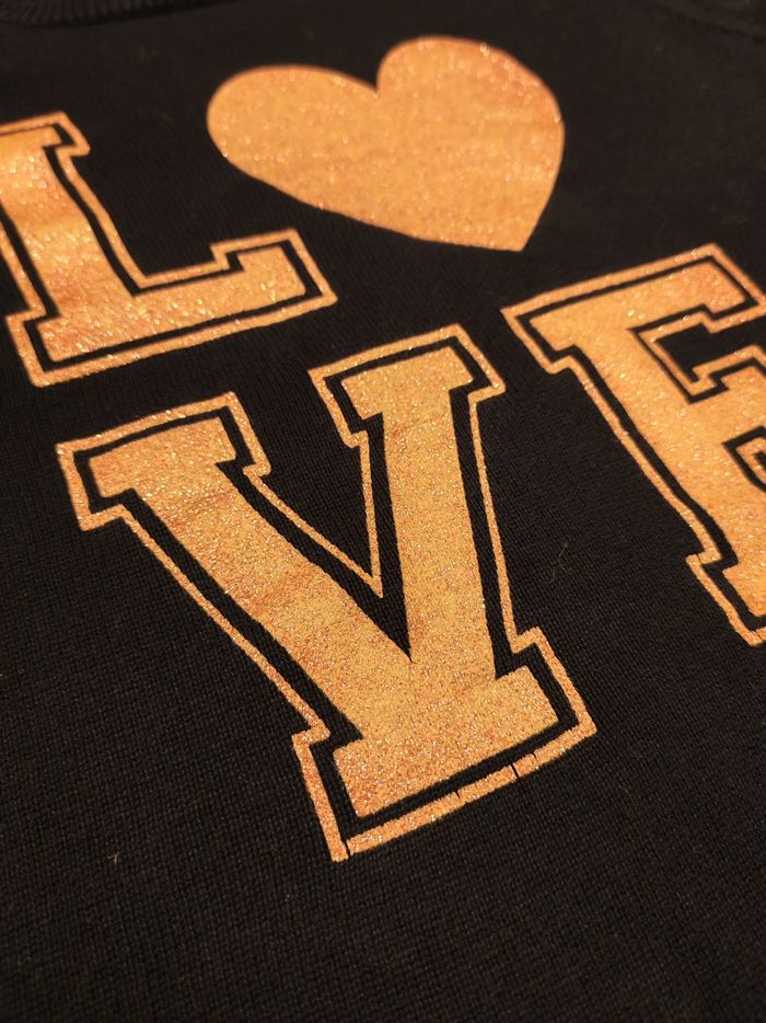 Joli motif LOVE avec cœur pailleté rose, doux et agréable à porter.