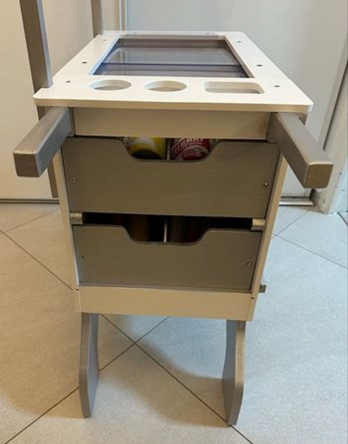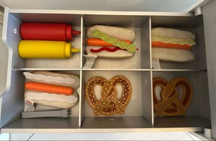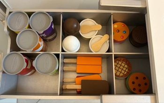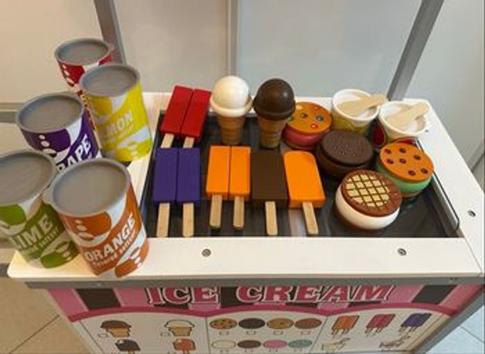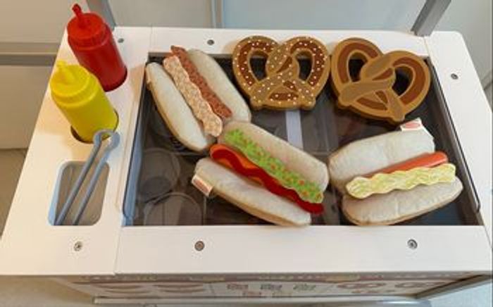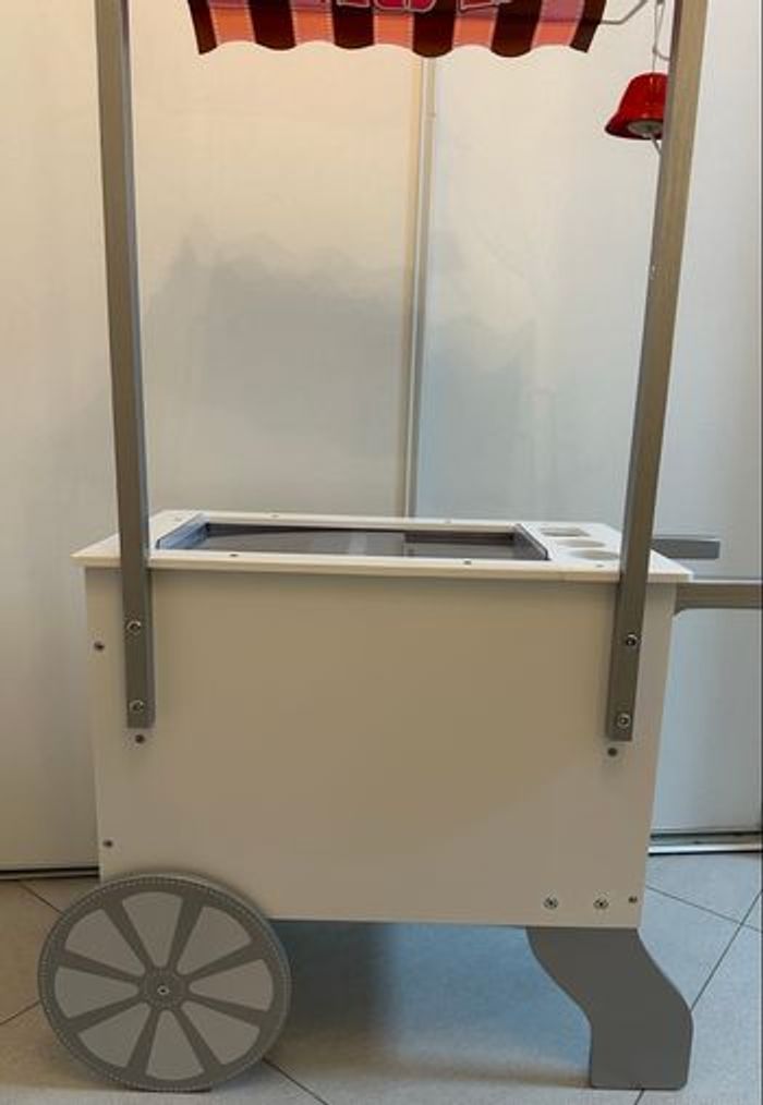 Un chariot roulant, réversible, combiné pour la vente de glaces et de hot-dogs. Cette marchande en bois pour enfant comprend un chariot d'aliments avec tiroirs fonctionnels, un auvent réversible, une clochette, un menu réutilisable, 5 cannettes de boissons gazeuses avec couvercles, ketchup et sauce brune, 2 bretzels et pinces, 3 hot-dogs, 3 petits pains avec 6 garnitures, 2 coupes à glace avec couvercles et cuillères, 2 cornets de glace, 8 sucettes glacées, 12 pièces de sandwich de crème glacée à réaliser soi-même.