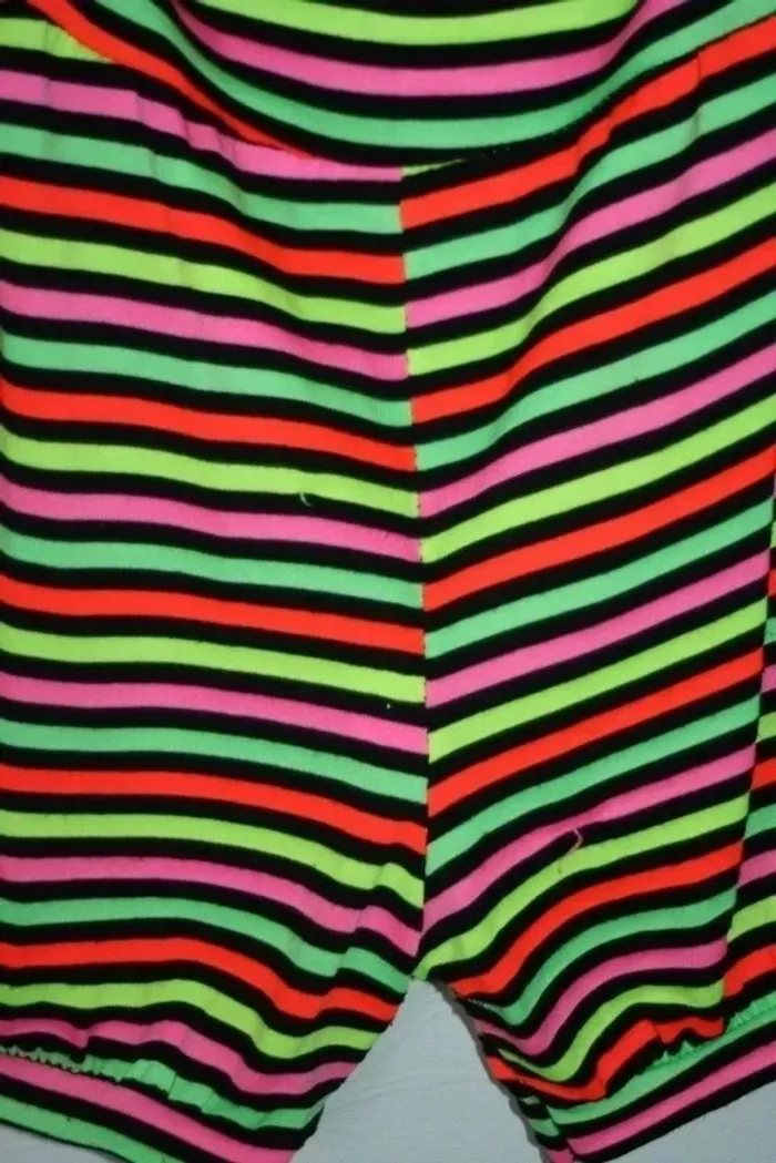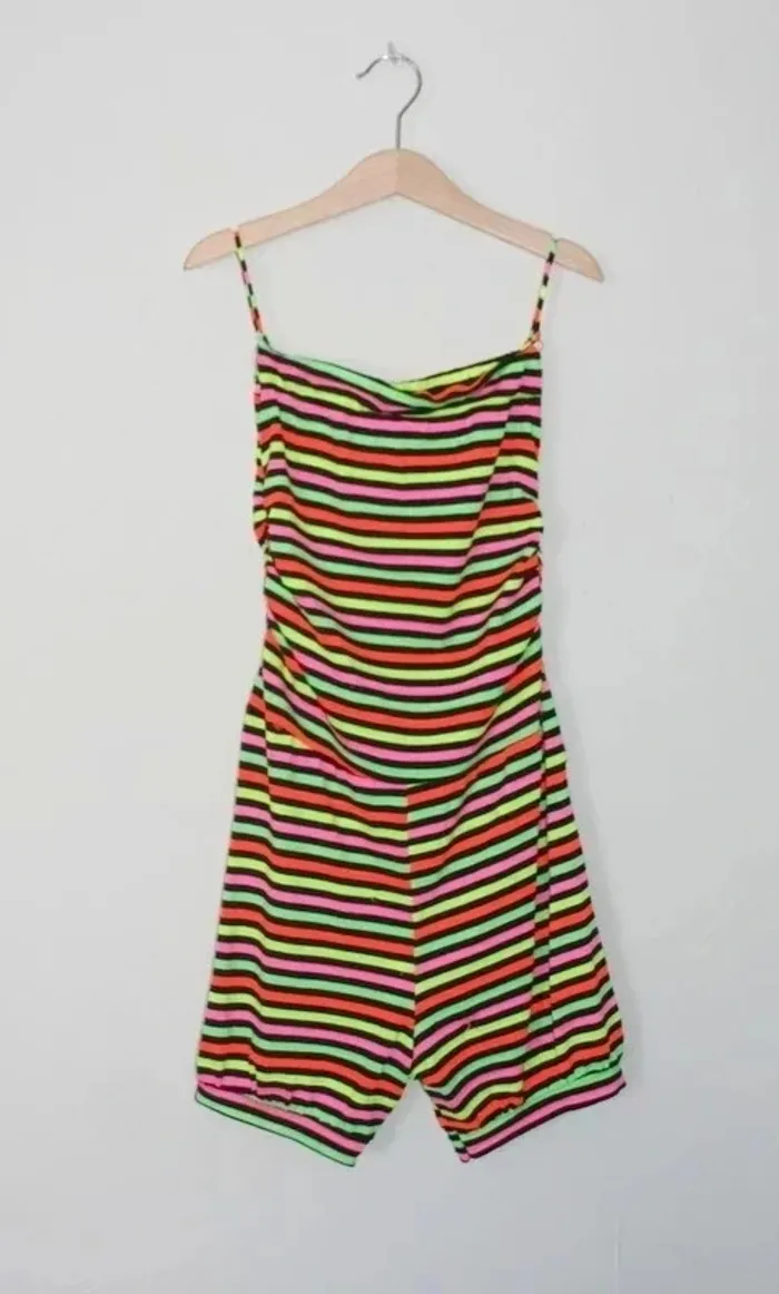 Combi bustier (pas de bretelles ce sont les attaches-cintres) à rayures fluo, noté 14 ans mais taille 12 ans, 100g