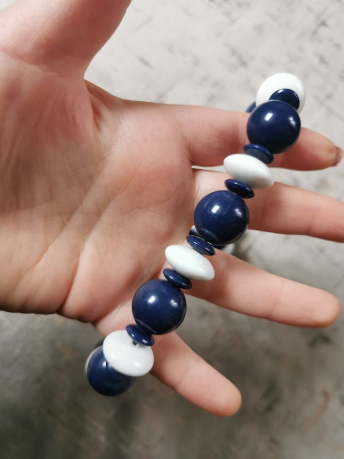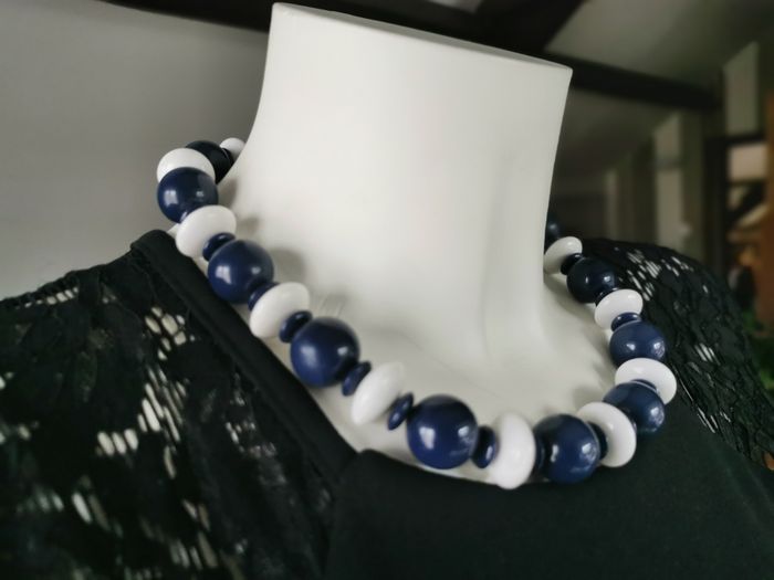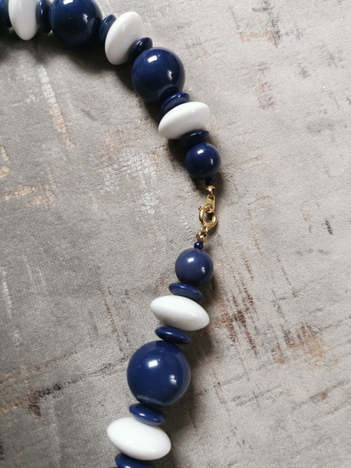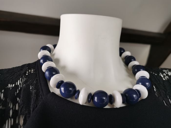 Collier de perles bleu marine et blanc vintage des années 1980, probablement, les perles en plastique, en très bon état. Dimensions : Longueur : 47 cm Diamètre des perles : 15 mm Poids : 70g