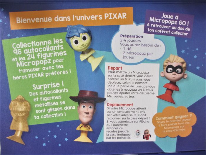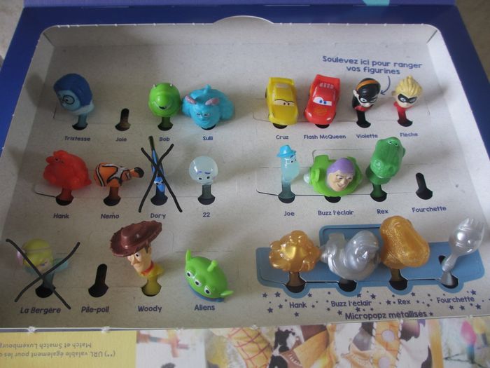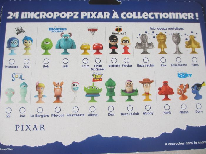 Collection Pixar « Crois en tes rêves » Cora/Match Figurine Micropopz à 0,40 € et autocollants à 0,10 € pièce. 30 € tout le lot comprenant tous les Micropopz et autocollants ci-dessous, avec la boîte. 26 Micropopz : Tristesse (x1), Bob (x2), Sulli (x1), Hank (x2), 22 (x1), Woody (x1), Cruz (x2), Violette (x3), Flèche (x2), Buzz l’éclair (x1), Hank métallisé (x4), Buzz l’éclair métallisé (x4), Rex métallisé (x1), Fourchette métallisée (x1) 288 Autocollants : sont disponibles les n° 1(x3)-2(x3)-3(x5)-4(x1)-5(x1)-6(x3)-7(x1)-8(x1)-9(x4)-10(x3)-11(x1)-12(x4)-13(x2)-14(x2)-15(x1)-16(x2)-17(x2)-18(x4)-19(x3)-20(x4)-21(x3)-22(x3)-23(x5)-24(x2)-25(x3)-26(x4)-27(x2)-28(x4)-29(x2)-30(x3)-31(x2)-32(x5)-33(x2)-34(x4)-35(x4)-36(x1)-37(x1)-38(x2)-39(x3)-40(x4)-41(x4)-42(x3)-43(x5)-44(x4)-45(x4)-46(x4)-47(x5)-48(x1)-49(x3)-50(x2)-51(x1)-52(x3)-53(x8)-54(x3)-55(x4)-56(x3)-57(x2)-58(x3)-59(x2)-60(x4)-61(x2)-62(x3)-63(x5)-64(x3)-65(x6)-66(x1)-67(x1)-68(x2)-69(x8)-70(x1)-71(x2)-72(x3)-74(x4)-75(x3)-76(x5)-77(x2)-78(x1)-79(x6)-80(x4)-81(x3)-82(x4)-83(x4)-84(x6)-85(x2)-86(x1)-87(x5)-88(x2)-89(x2)-90(x3)-91(x3)-92(x1)-93(x1)-94(x4)-95(x3)-96(x6) Etat neuf.