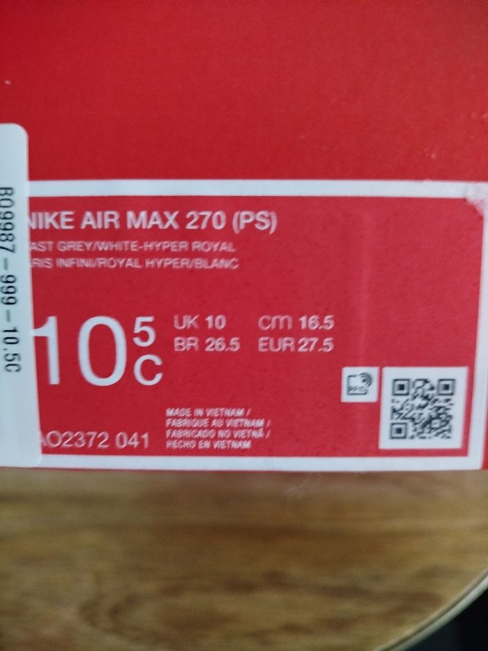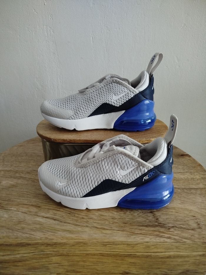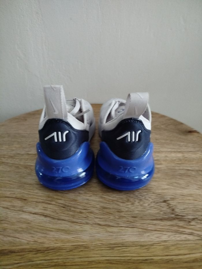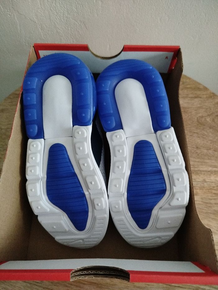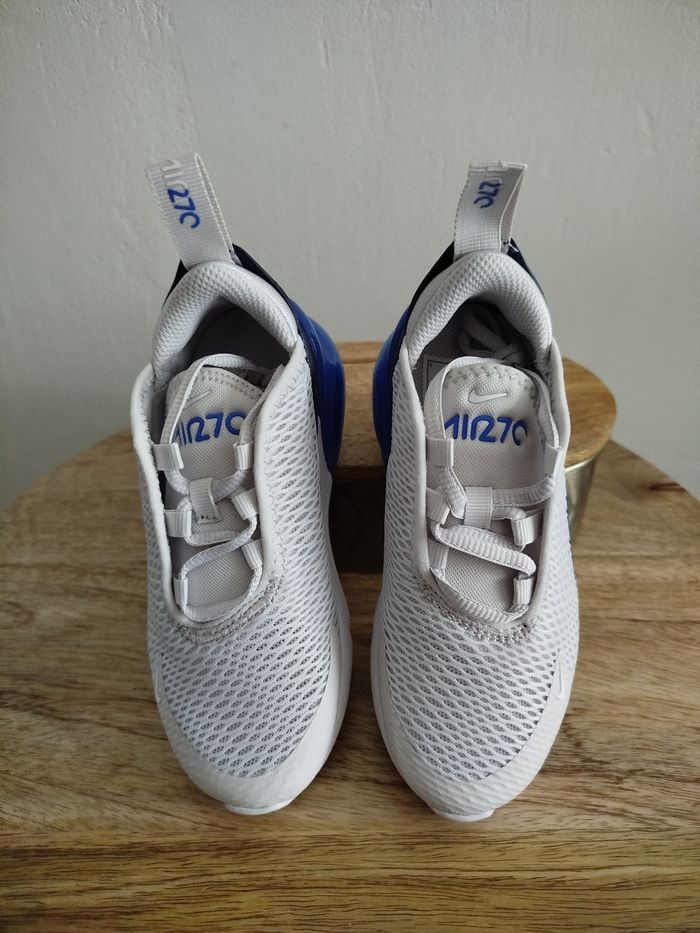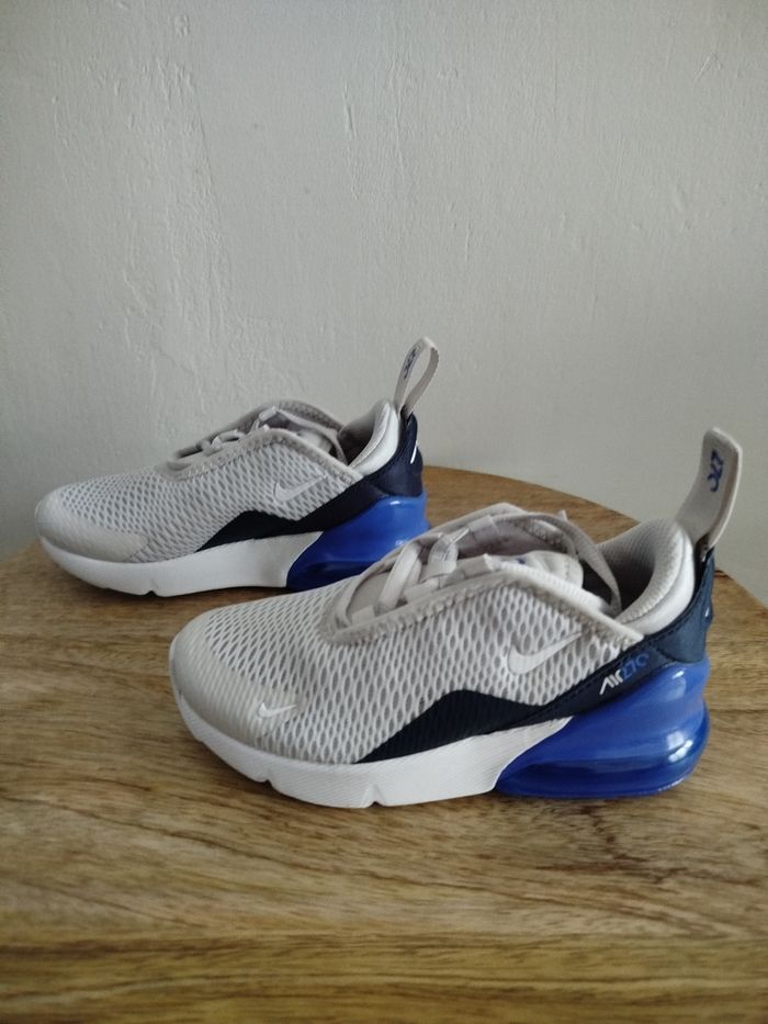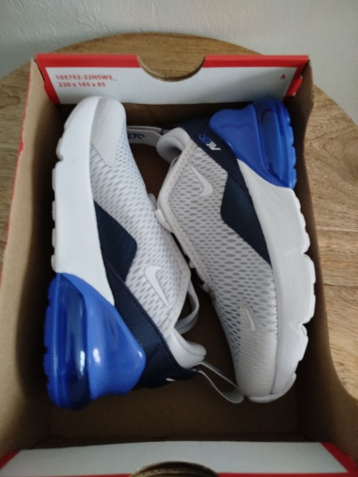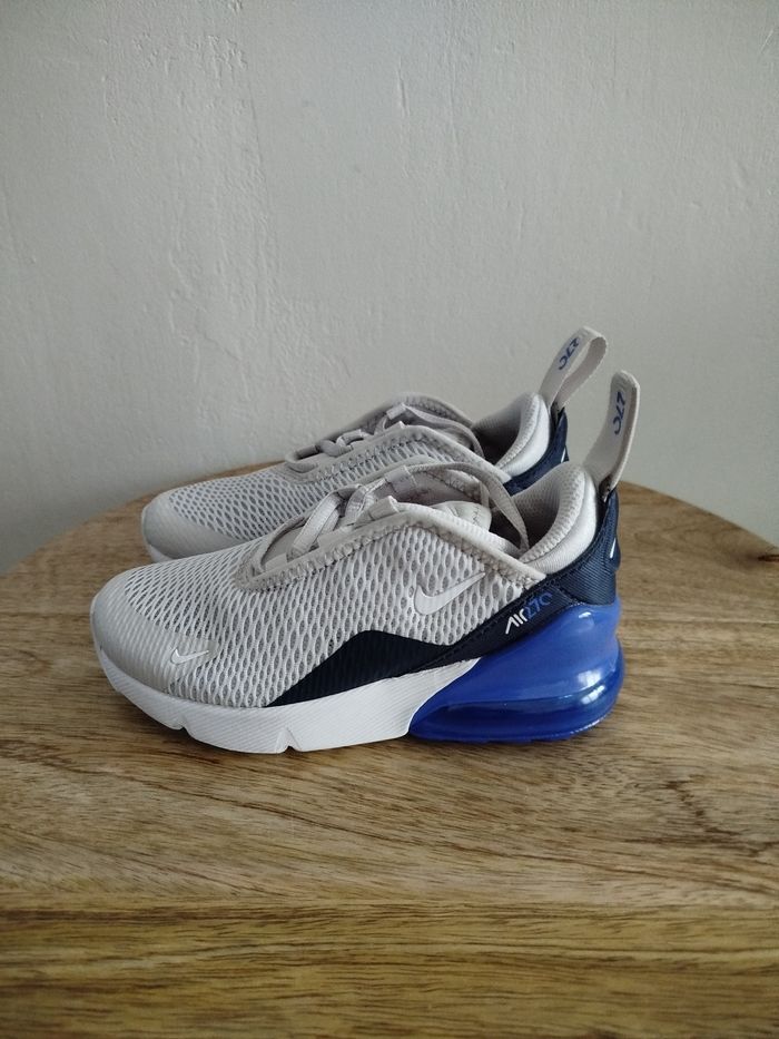 Je vends cette paire de baskets Nike pour enfant. - Marque : Nike - Pointure : 27,5 - Couleur : gris & bleu - Modèle : Air Max 270 - État Neuf Boîte sans couvercle N'hésitez pas à me contacter pour plus d'informations ou de photos.