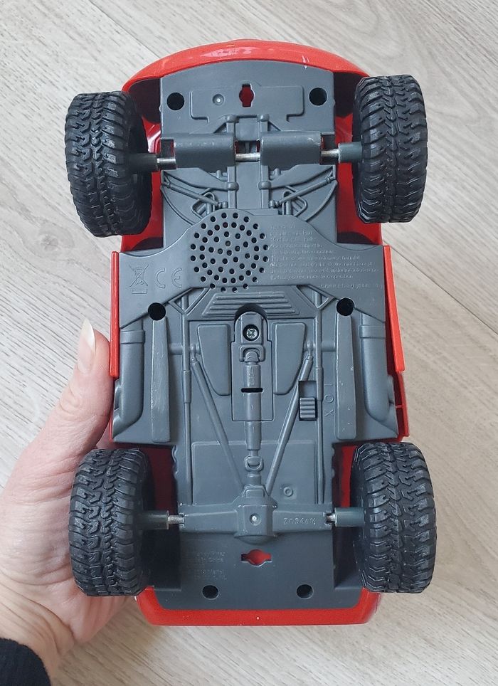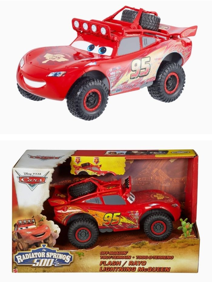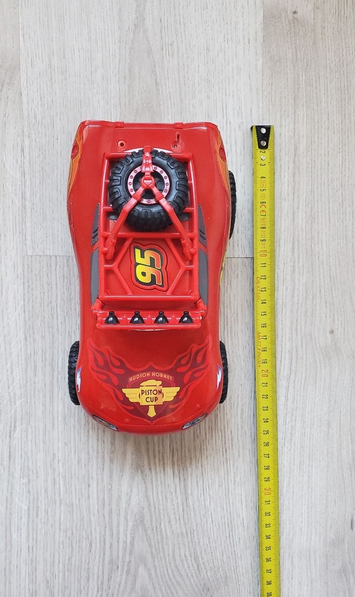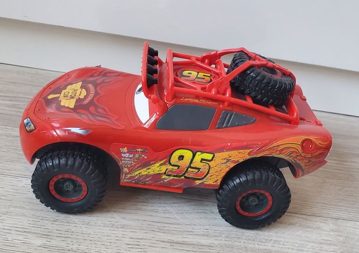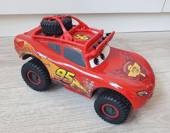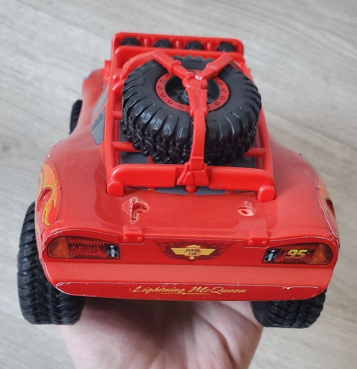 Flash McQueen. Au départ, c'était une voiture avec des effetssonores, mais elle ne fonctionne plus. Elle devient donc une voiture à pousser. Aileron arrière cassé, d'où le petit prix....