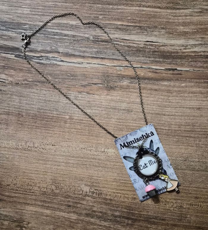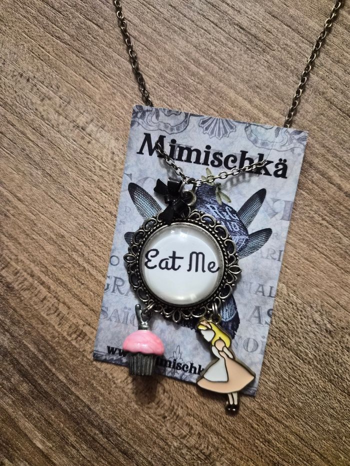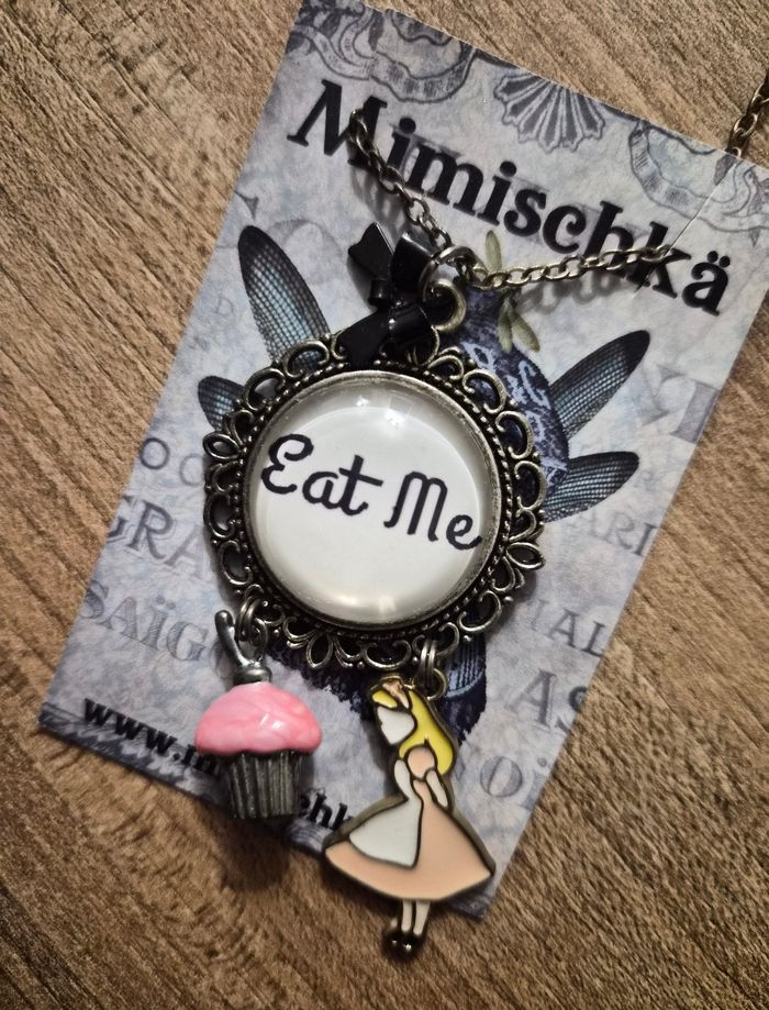 Jolie collier sur le thème Alice au pays des merveilles Cabochon "eat me" agrémenté d'ûe pampilles Alice et une pampille cupcake Fait par la créatrice Mimischka #bijouxtattoogirl_3