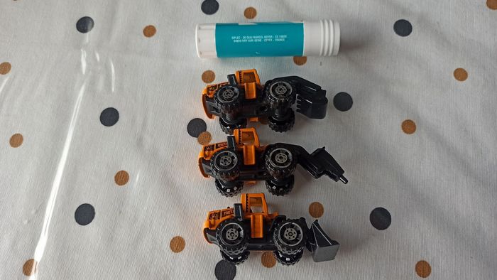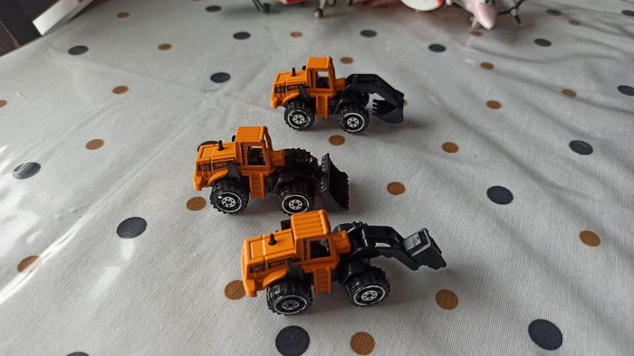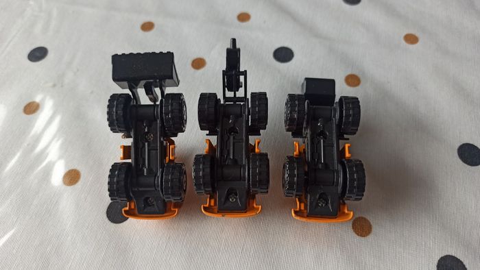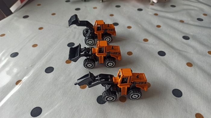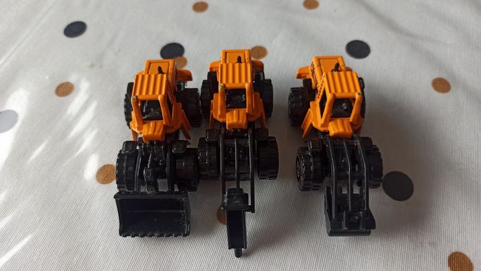 Lot de 3 mini véhicules de chantier en métal. Bon état général. Quelques légers éclats de peinture